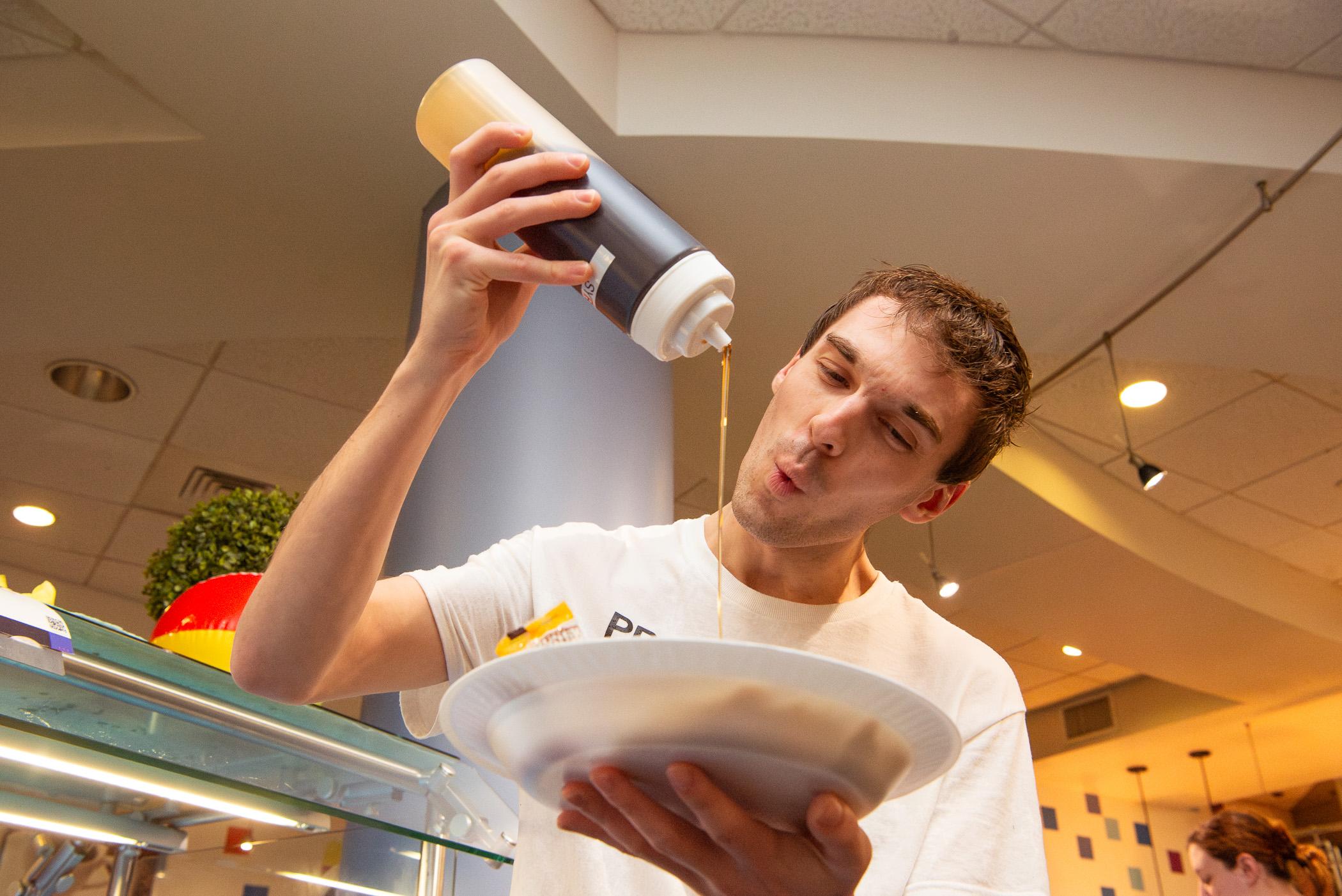 Pouring it on! Justin C. Miller, a graphic design student from Lewisburg, is angling for that sweet taste of success.