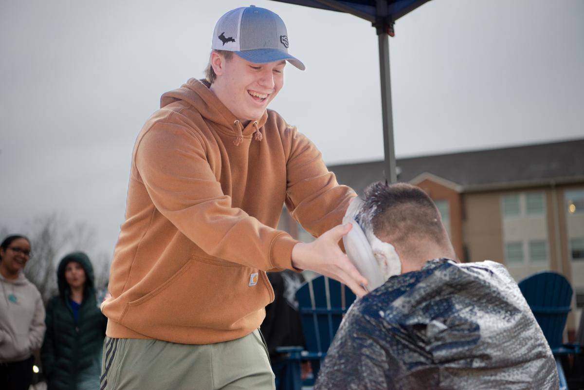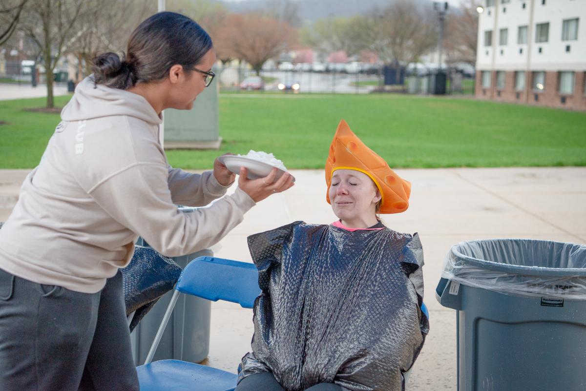 For their “Spring All Hall,” Residence Life staff from Clinton, Delaware & Juniata Halls found a fun and sweet way to bring residents together for a good cause: They encouraged students to smash a plateful of whipped cream into the faces of resident assistants or staff.