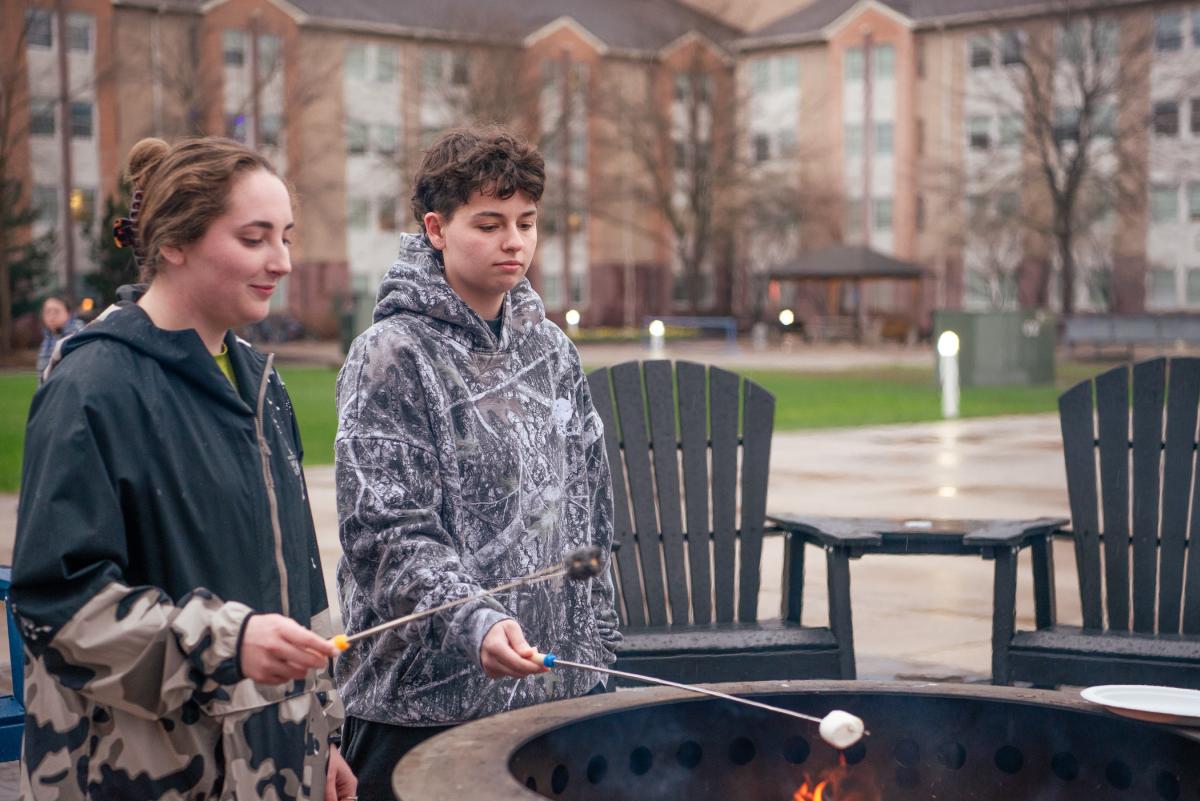 Roasting marshmallows, Greiner (left) and Angelina Bellantone warm up on a cool spring evening by the Residence Life fire pit.