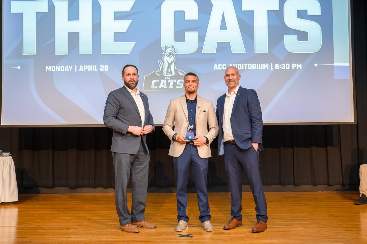 Eric Hunt (center), the Wildcats' athletic communications coordinator, is honored as Staff Member of the Year. Joining him are Matt Blymier (left), assistant director of athletics for compliance and athletic communications, and Scott Kennell, director of athletics.