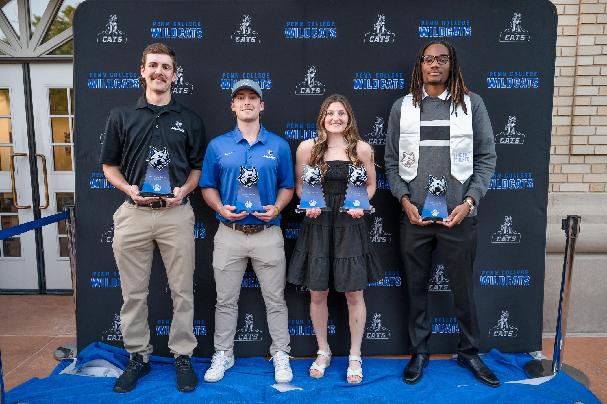 Top award winners at Penn College Athletics' eighth annual Celebrating Athletic Triumphs and Successes ceremony, also known as "The CATS" awards, are (from left): Walt Heiser (men's lacrosse), Male Scholar-Athlete of the Year; Elliot Dotson (men's lacrosse), Male Newcomer of the Year; Megan Kurian (women's soccer), Female Newcomer of the Year and Female Athlete of the Year; and Livingston Cross (men's basketball), Male Athlete of the Year. Not pictured is: Kayleigh Miller (women's basketball & cross country), Female Scholar-Athlete honoree.