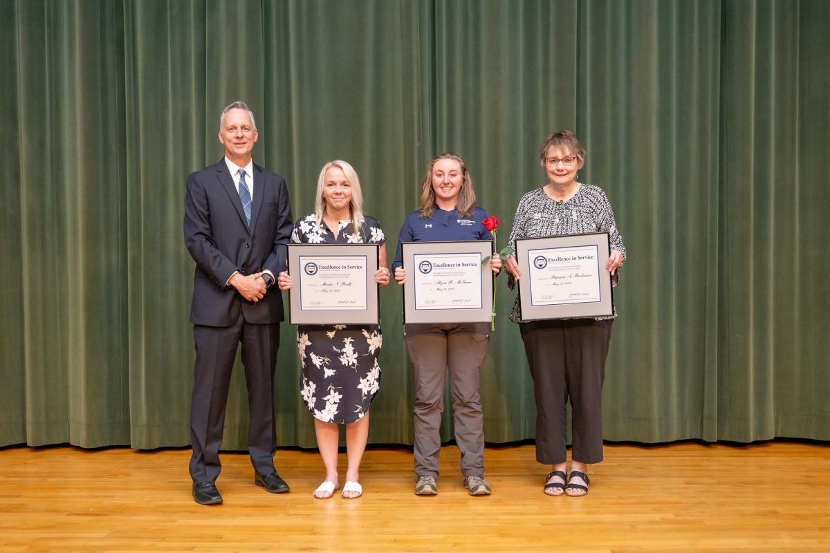 President Reed celebrates Distinguished Staff Award recipients (from left) Maria N. Piselli, registrar; Alyssa R. McGraw, horticulturist, first shift; and Patricia A. Beckman, acquisitions specialist continuing resources.