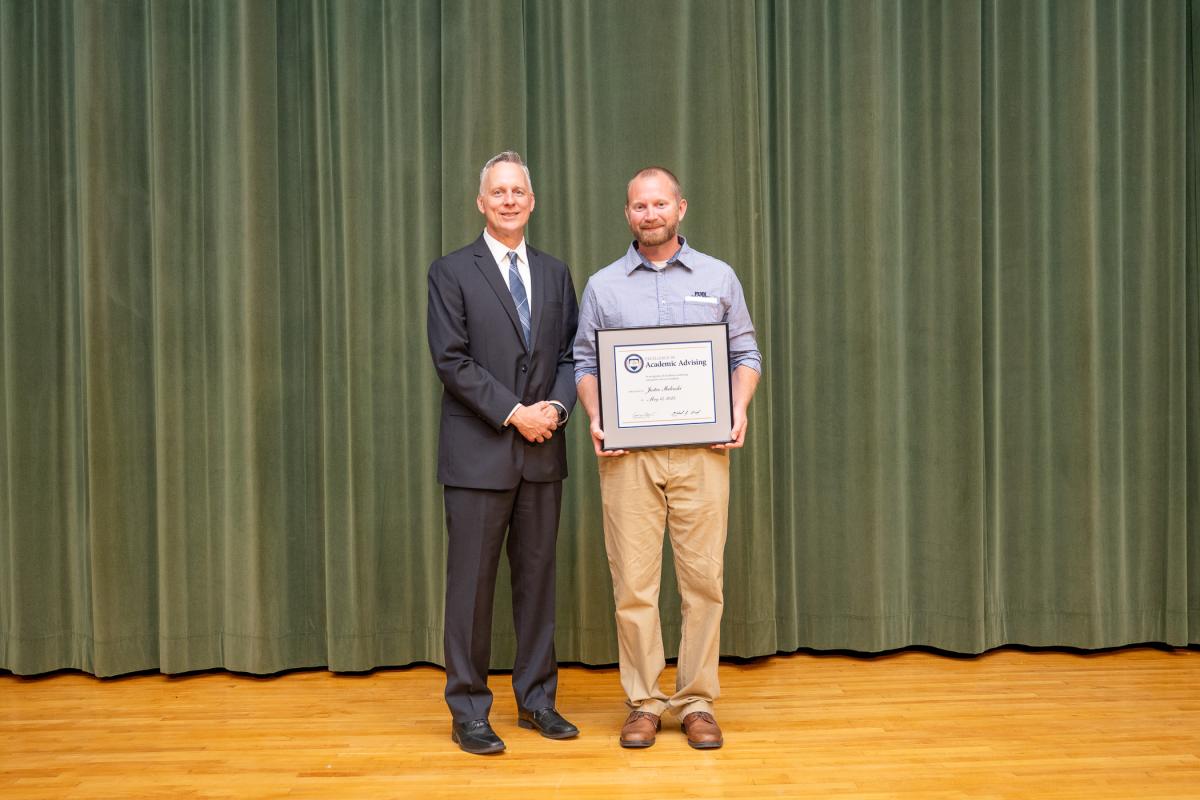 Justin Shelinski (right), instructor of horticulture, receives the Excellence in Academic Advising Award from President Reed.