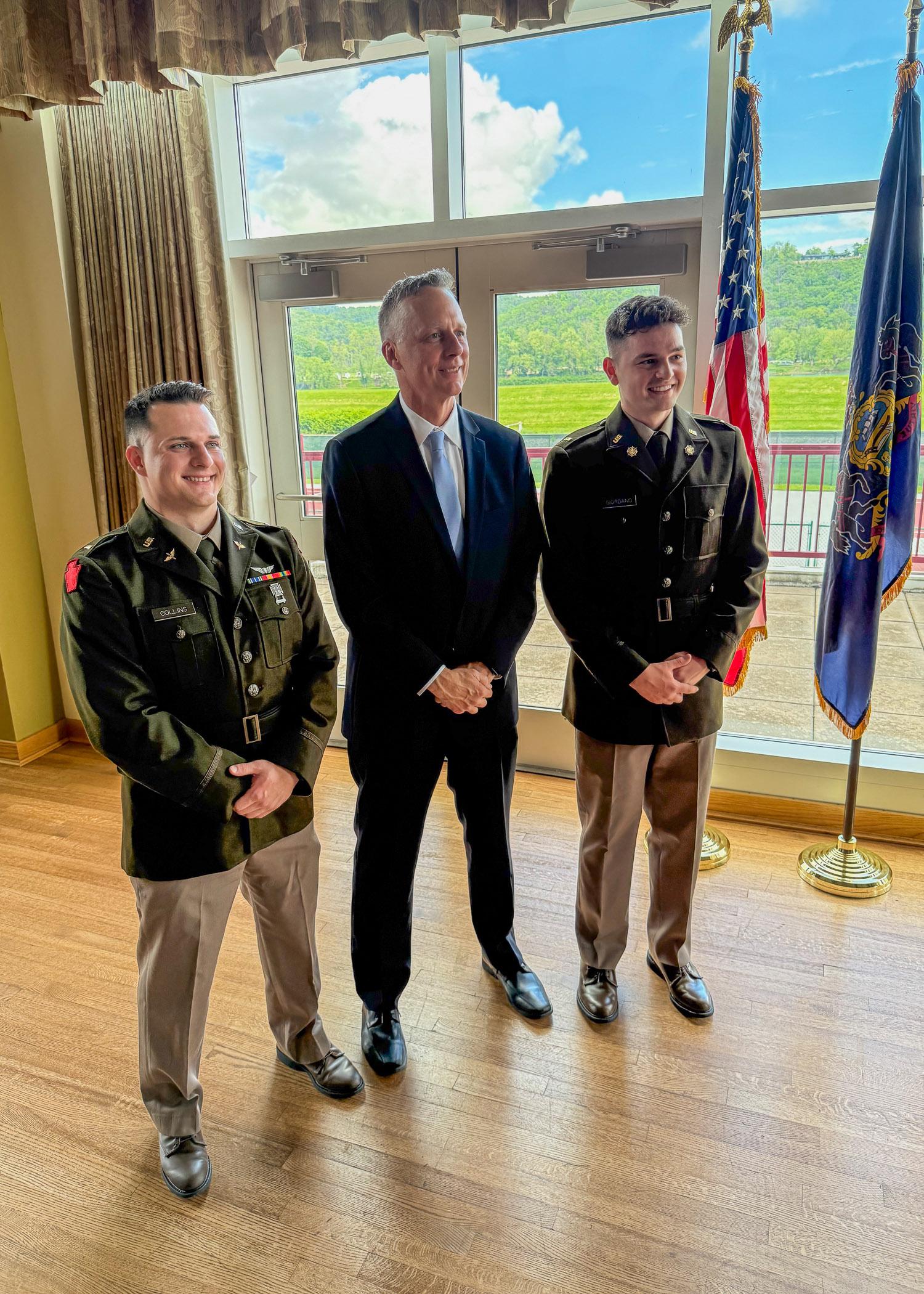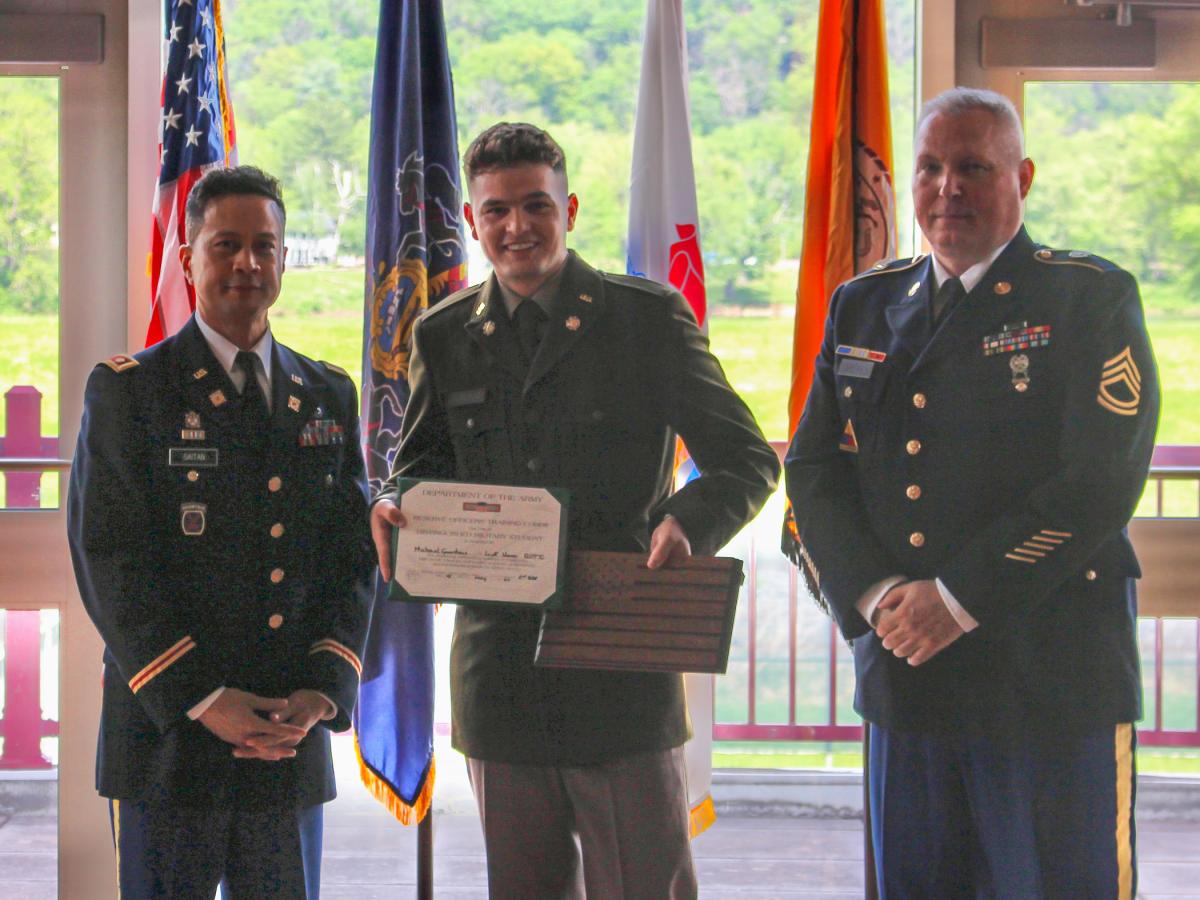 Giordano accepts the Distinguished Military Student Award from Gaitan (left) and Sgt. 1st Class Jeffrey Mally (right), ROTC instructor at Commonwealth University of Pennsylvania-Lock Haven.