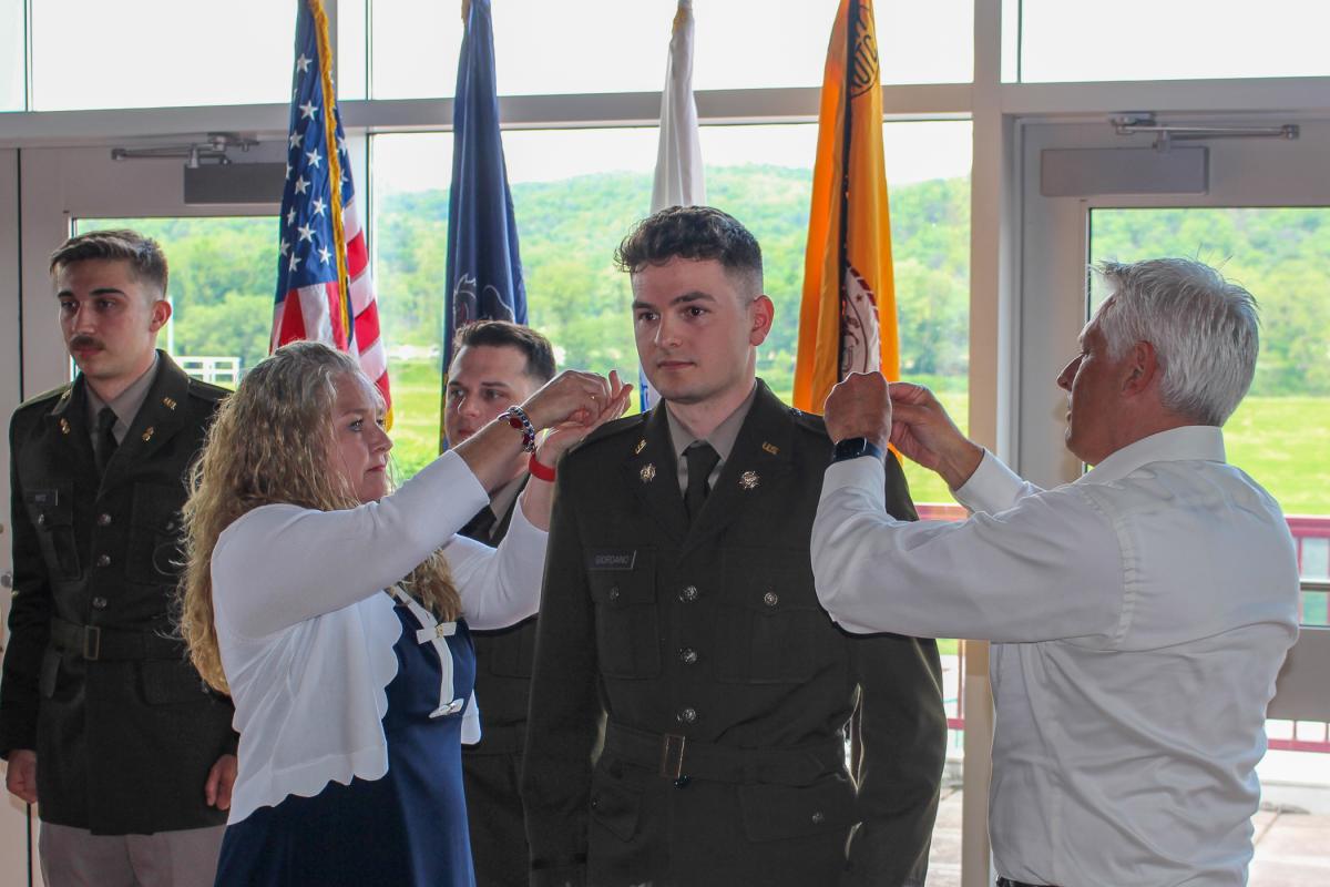 Giordano's parents, Mary and Darin, pin on his gold bars.
