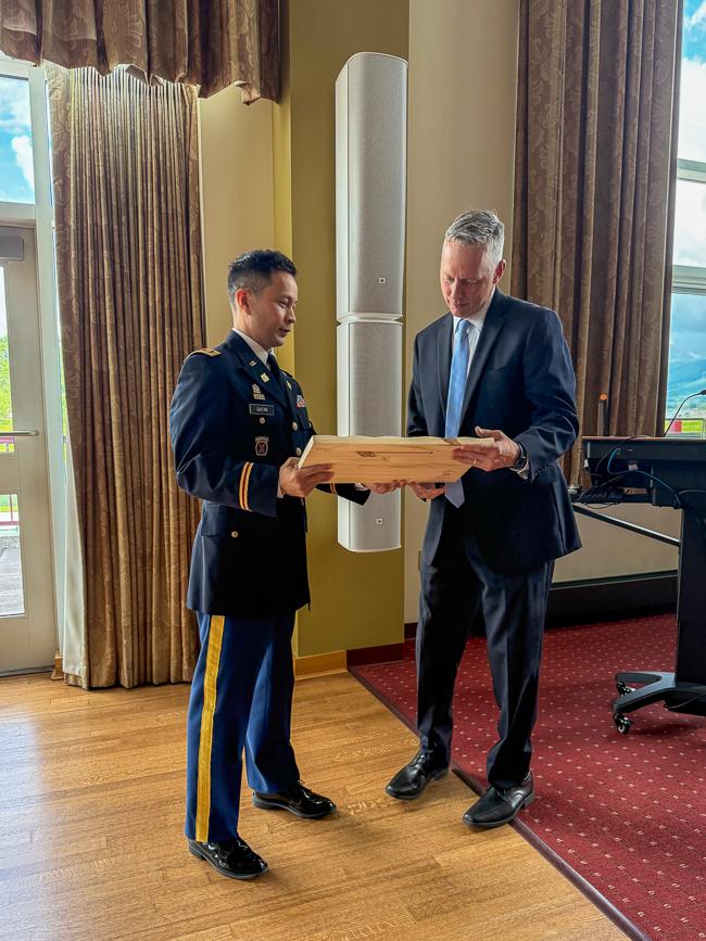 Maj. Daniel Gaitan (left), professor of military science at Commonwealth University of Pennsylvania-Lock Haven, presents Penn College President Reed with a plaque. Both men addressed the gathering.