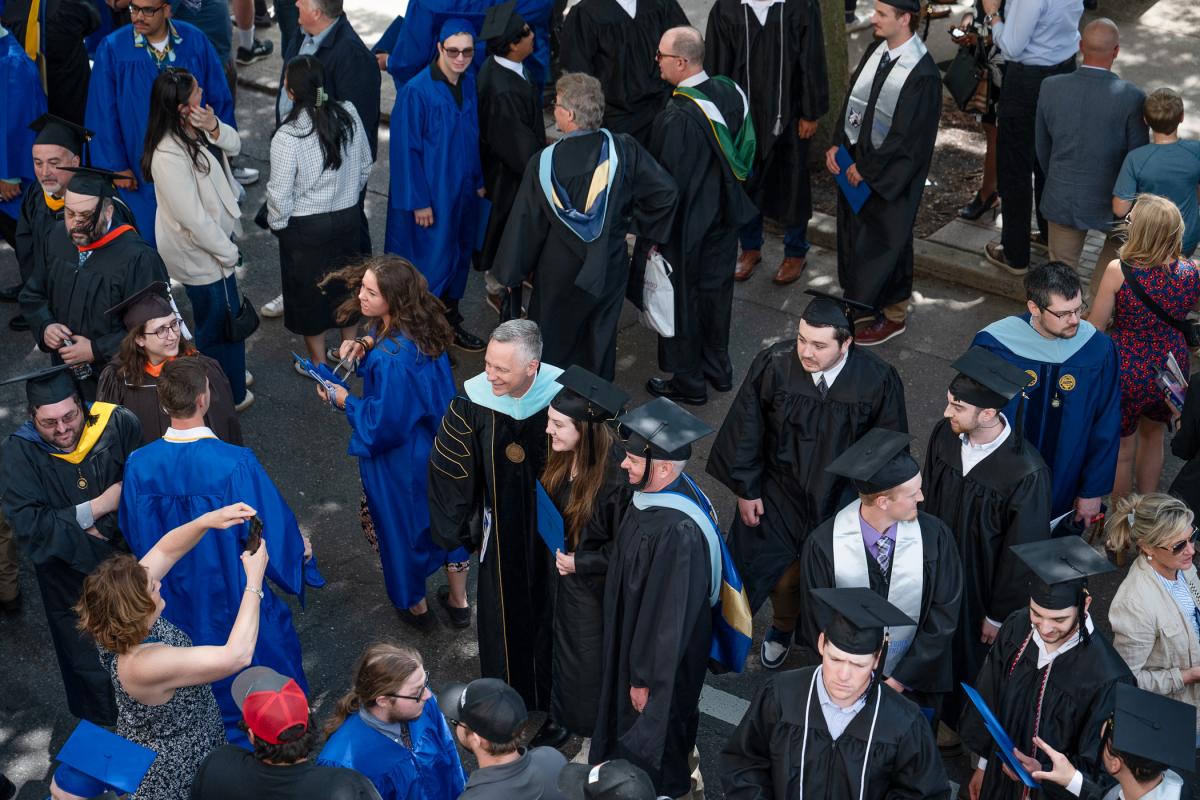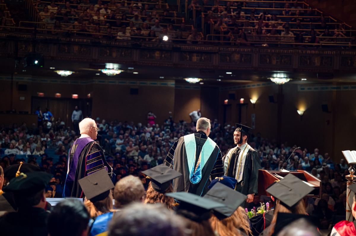 Student speaker Rees is congratulated by Reed, following his Saturday morning speech that encouraged listeners to continue "to learn, adapt and build relationships."