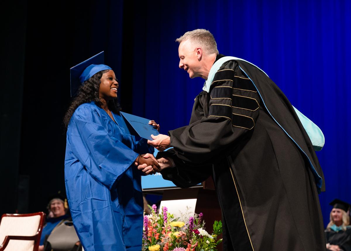 Charles J. Trimber II gives the president a hug as he crosses the stage. Trimber is a heating, ventilation & air conditioning engineering technology graduate.