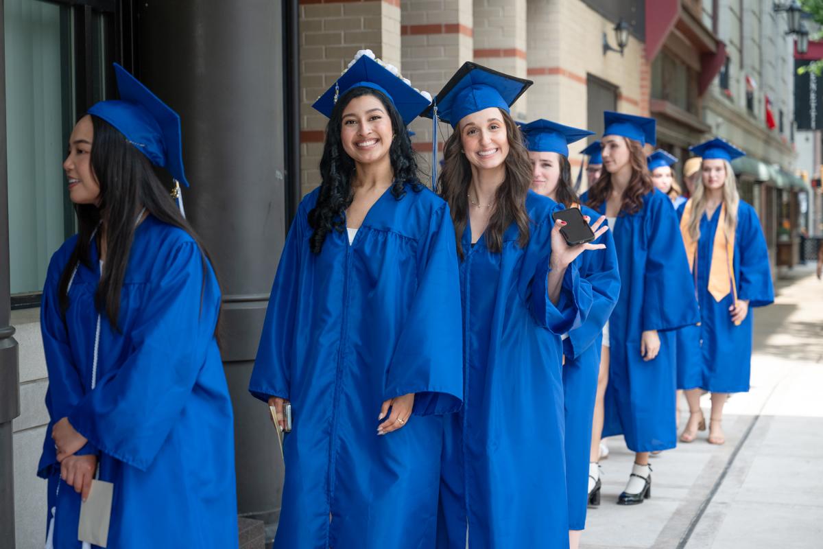 Energized as they enter the Community Arts Center in downtown Williamsport for the first of three Pennsylvania College of Technology Commencement ceremonies are these graduates of the human services & restorative justice major.