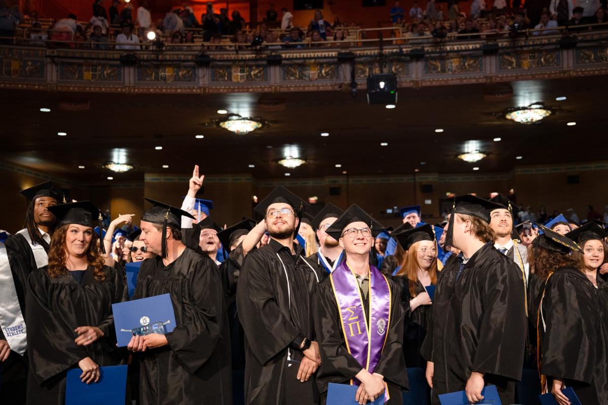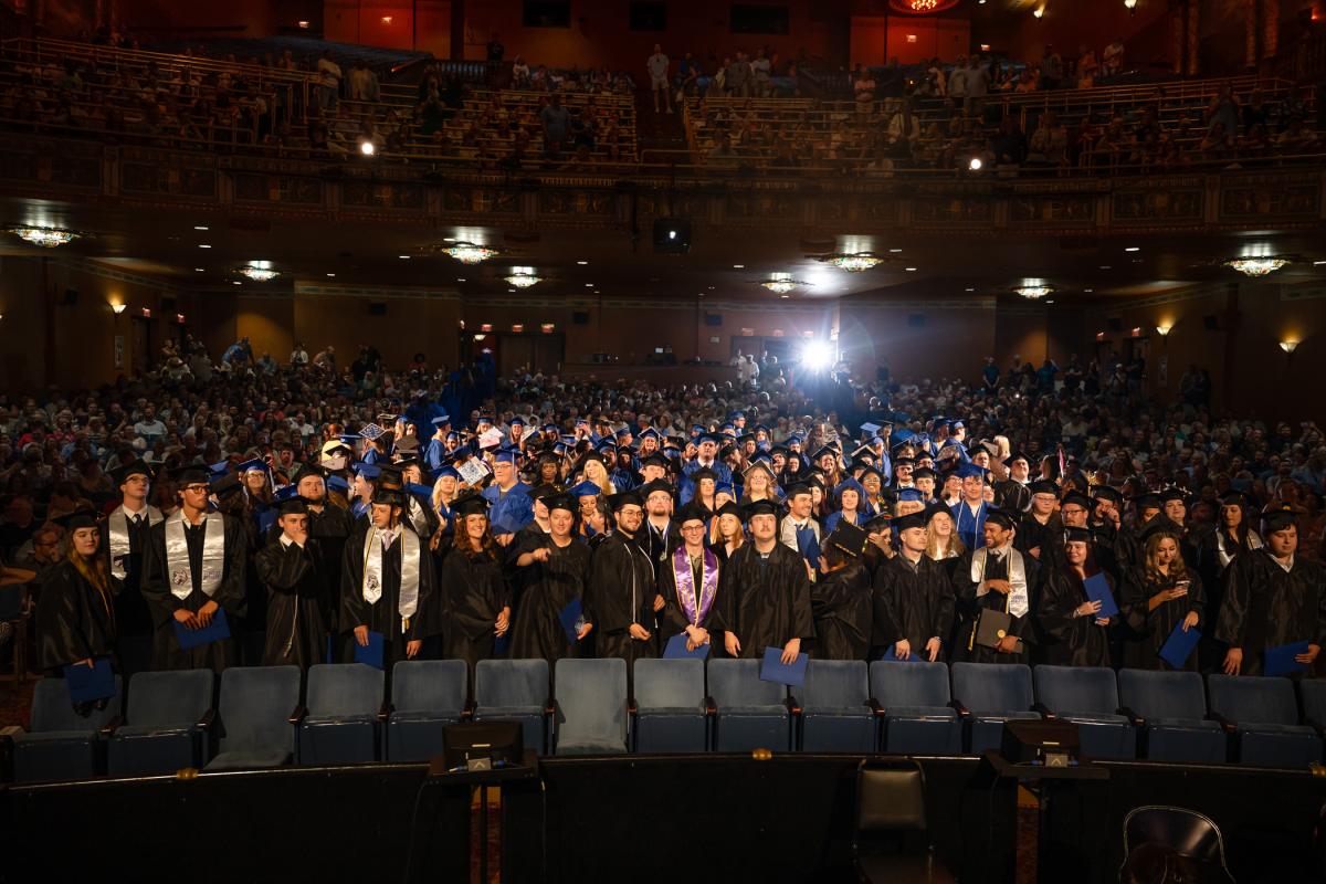 At the Genetti, a group of polymer engineering technology graduates wait to walk the stage and make a final memory with their retiring professor, Kirk A. Cantor (third from right).