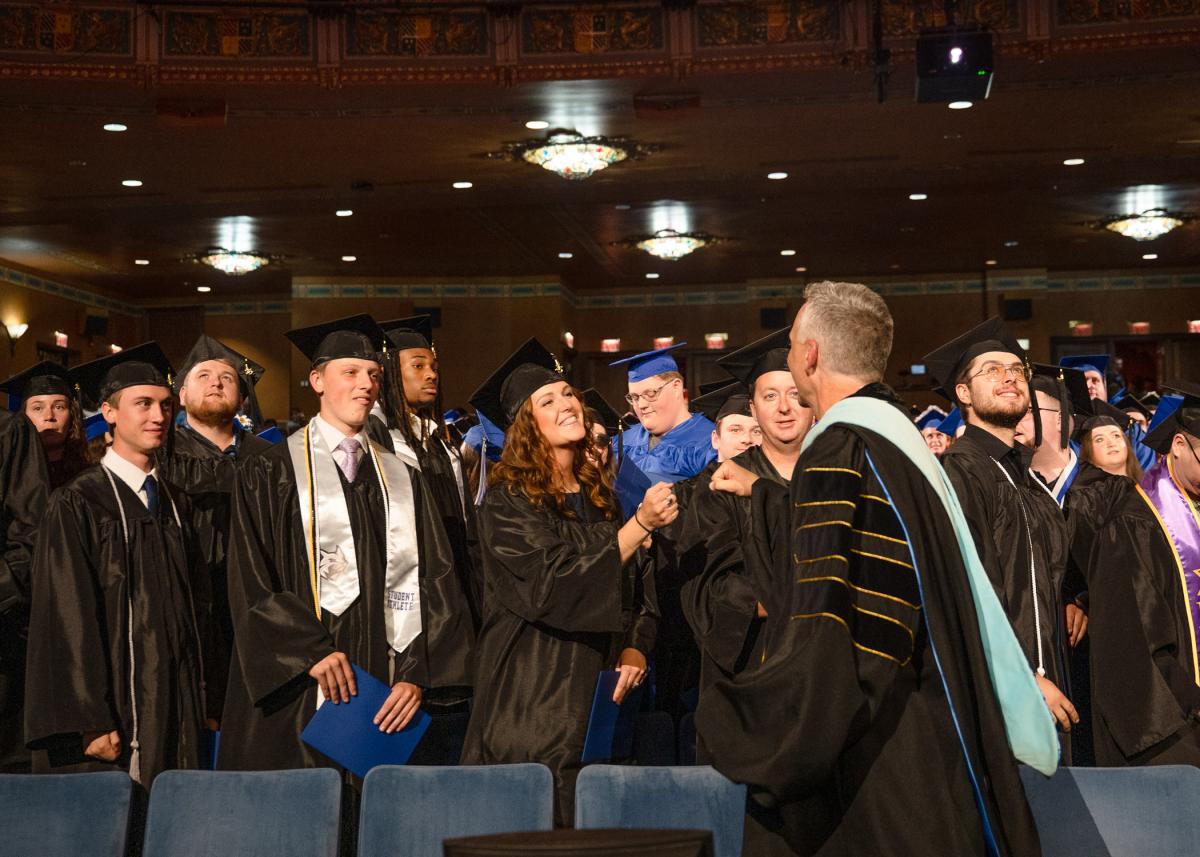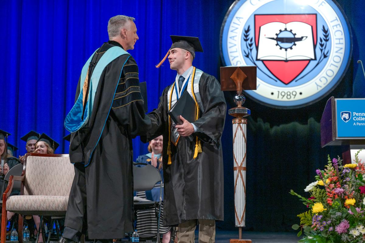 Yaw (left) and Reed greet Evan M. Brandenburg on stage. He earned his Bachelor of Science in welding & fabrication engineering technology and Associate of Applied Science in welding technology.
