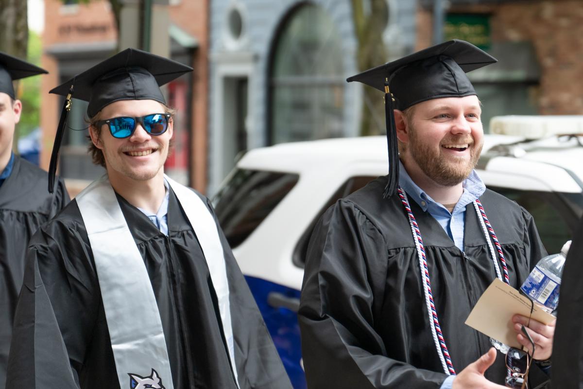 On their way! Graduates process from the Genetti Hotel to the Community Arts Center.