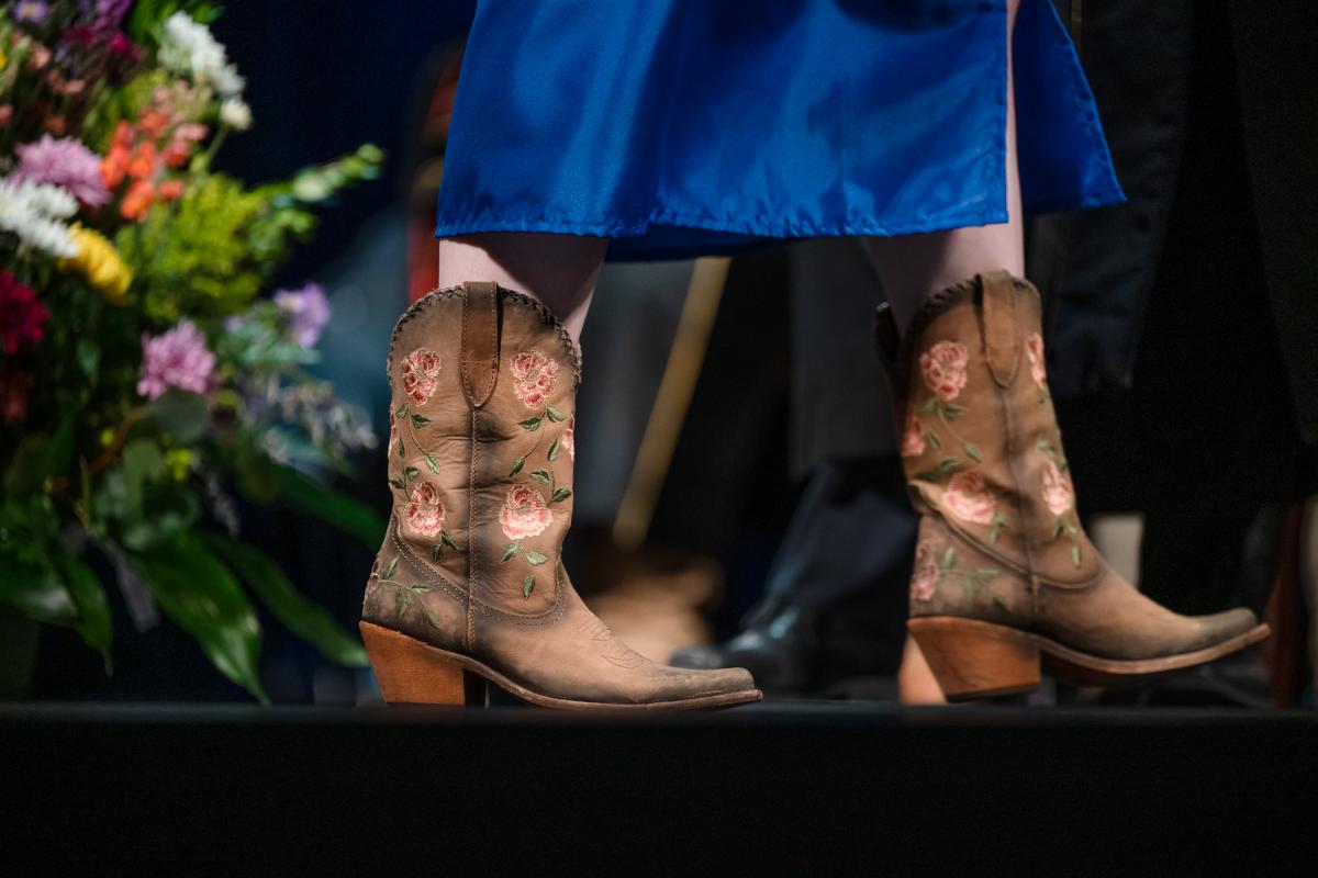 Army ROTC graduate MacKenzie L. Collins, who commissioned as a second lieutenant on Thursday, rises for acknowledgement, encouraged by the president. Collins earned his aviation maintenance technology degree.