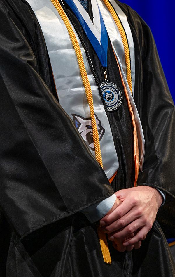 Evidence of a full college career: a Wildcat Athletics stole, Resident Assistant Medal and honors cords