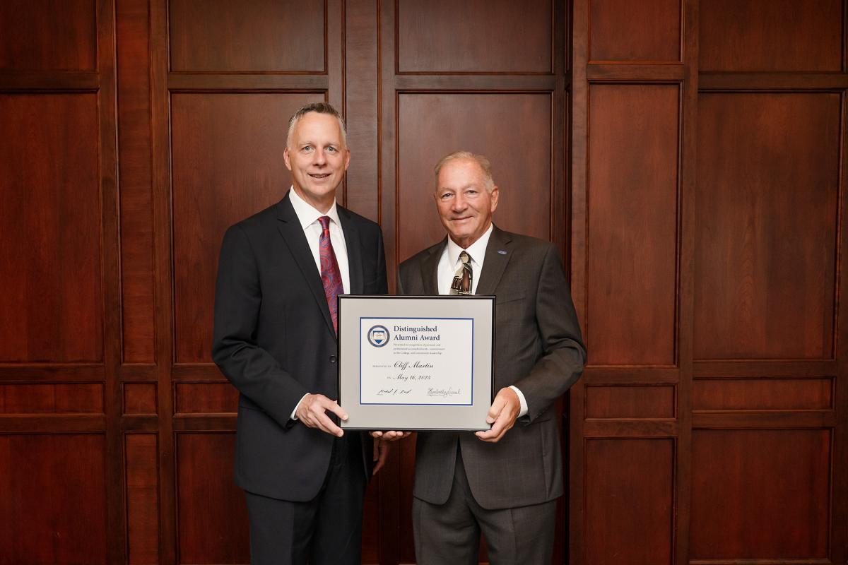Clifford H. Martin Jr., of Dade City, Florida, (right) was presented with a Distinguished Alumni Award at a Pennsylvania College of Technology Spring 2025 Commencement ceremony on May 17. He is congratulated here by President Michael J. Reed.