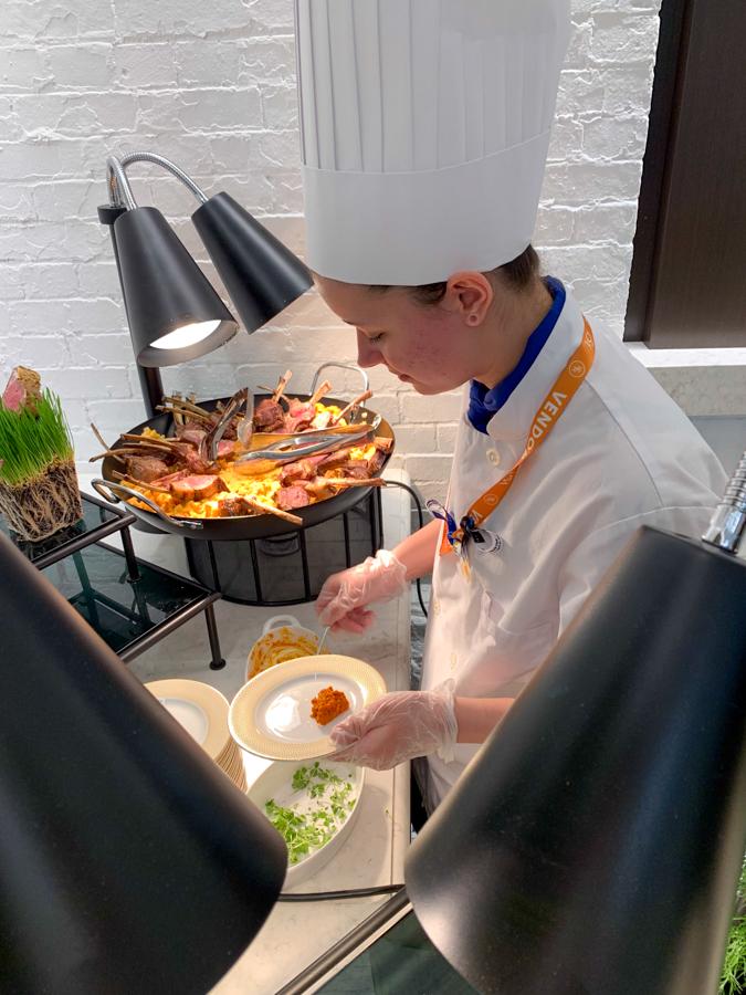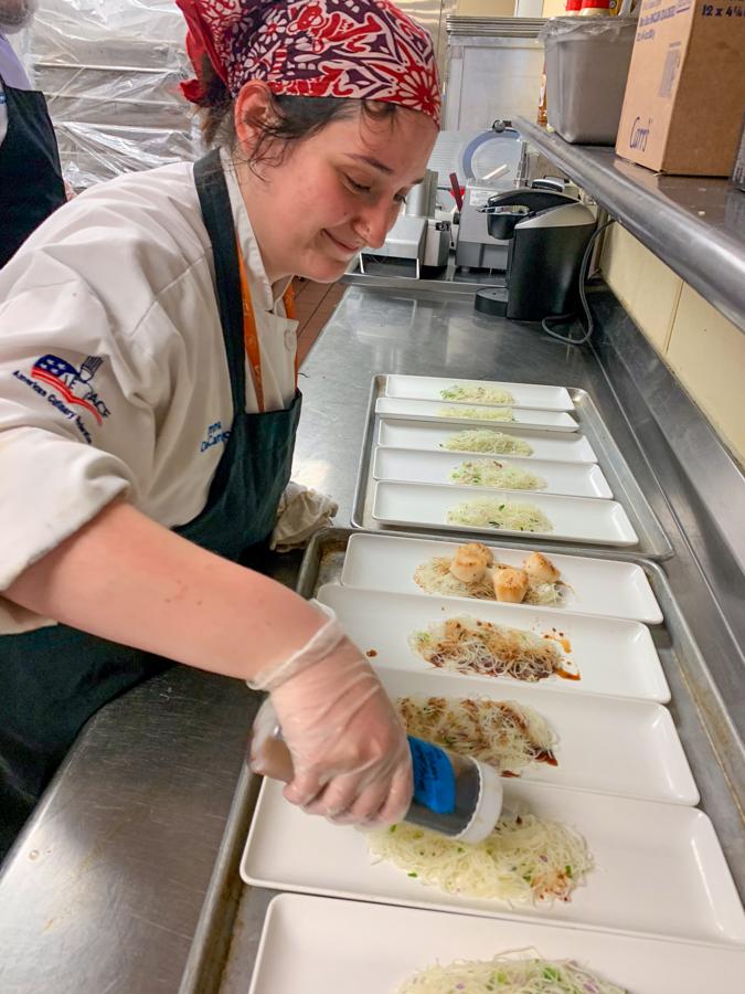 Emma E. Delcampo, of West Chester, builds a scallop entrée.