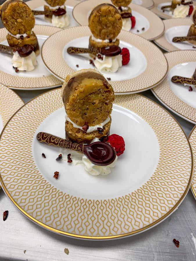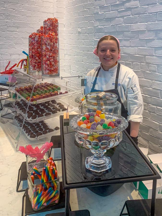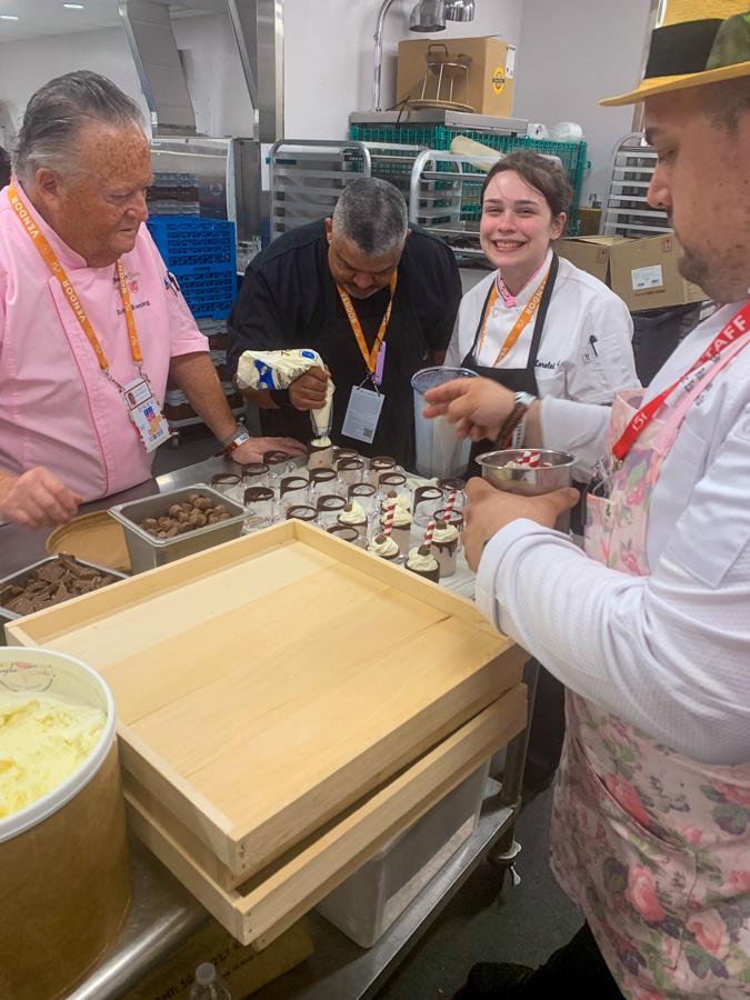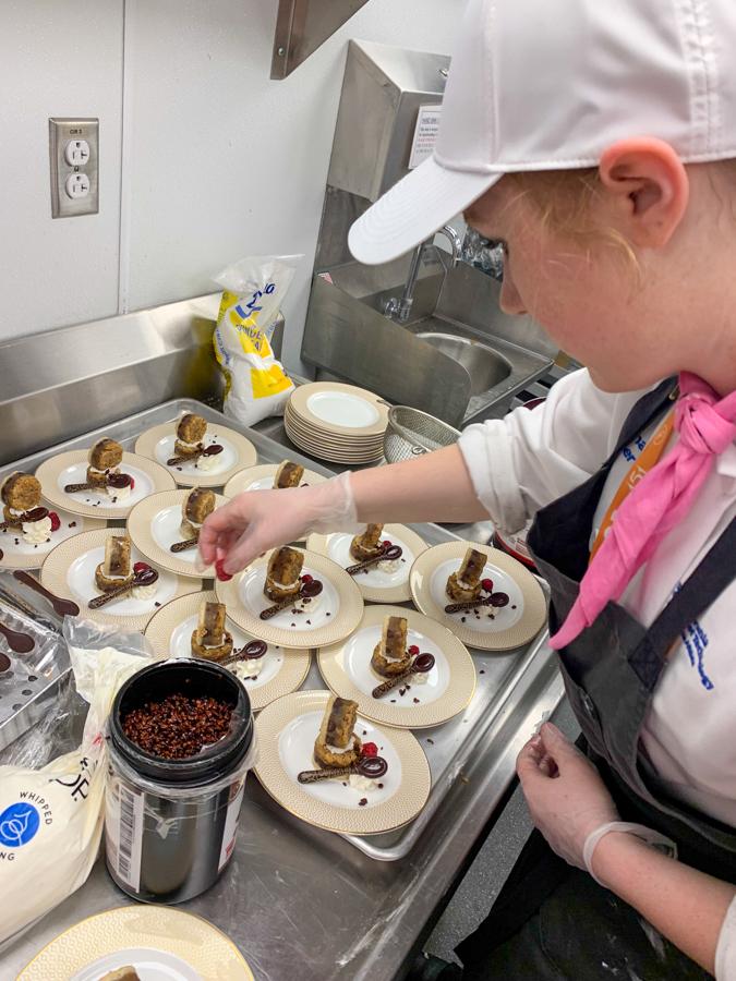 While assembling a dessert, Lorelei A. Elliott, of Middletown, rubs elbows with veteran chefs from around the country. On left is Chef Robin Rosenberg, vice president and chef de cuisine for Levy Restaurants. Rosenberg was the college’s 2018 Visiting Chef. On right is Chef Robert Lopez, senior executive chef for Levy.