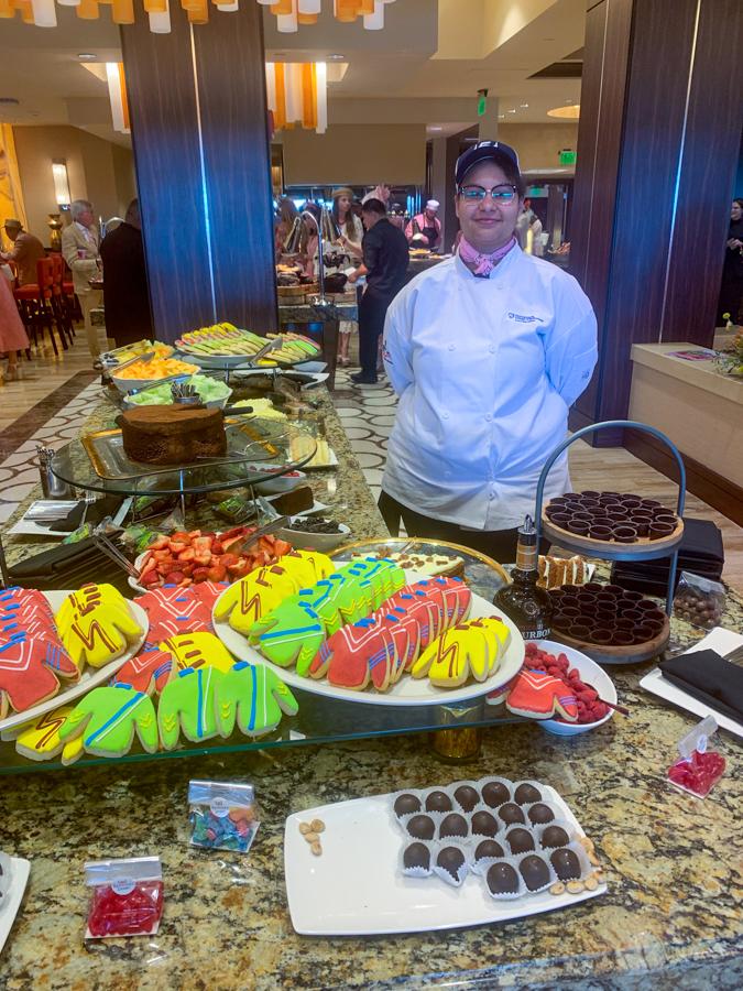 Le Jeune Chef’s Meesh Tarsa adds a “fascinator” to her Derby attire as she tends to guests in the Sky Terrace.