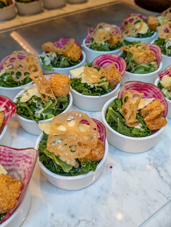 Paddock Caesar Salad, with red romaine lettuce, kale, Parmigiano Reggiano, fried capers, grilled focaccia and Caesar dressing.