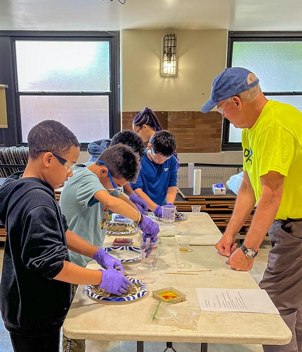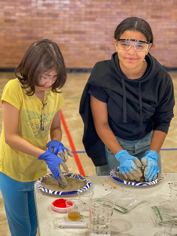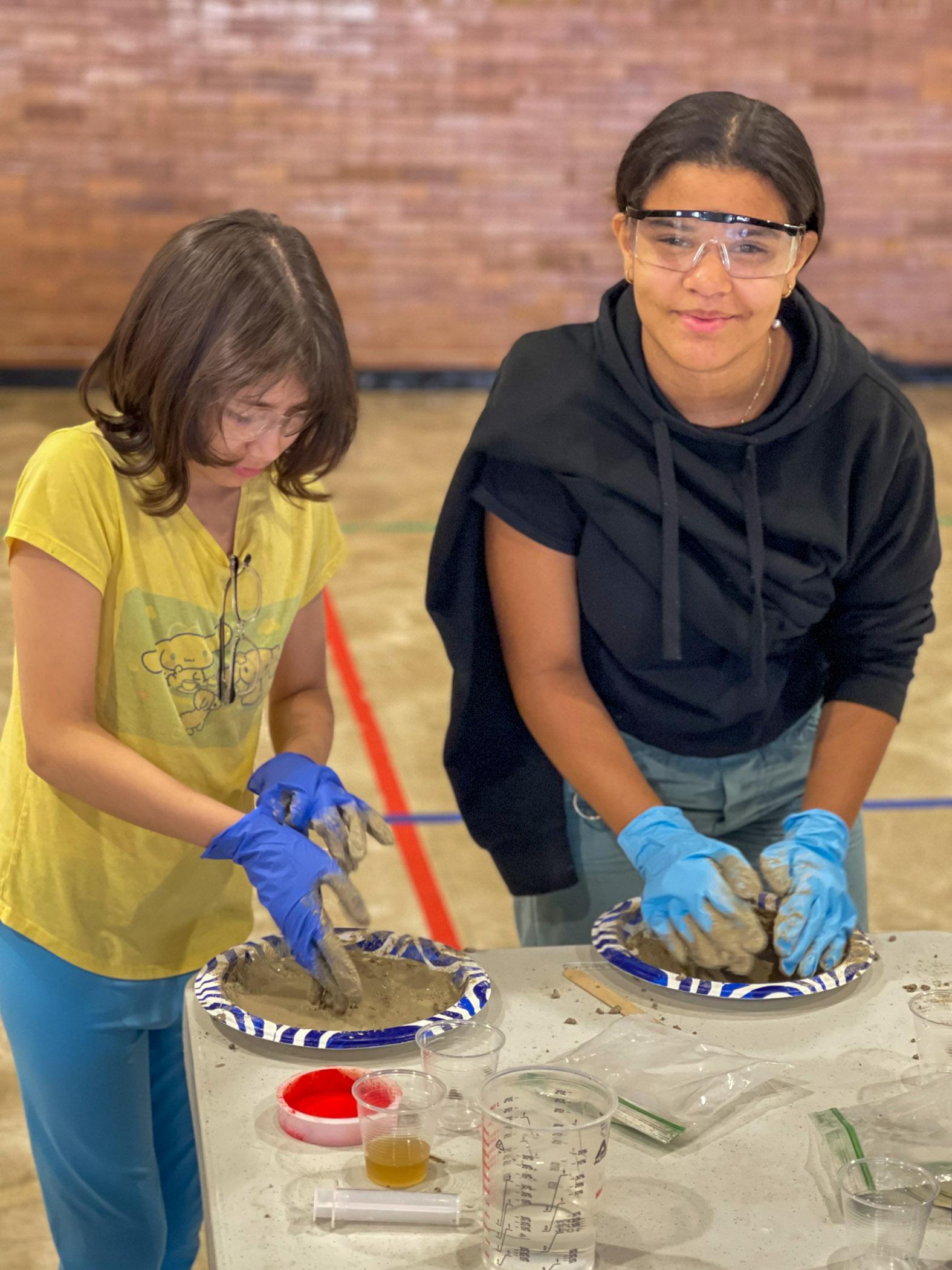 Fifth-graders mix ingredients to make concrete before pouring their mix into molds to form coasters.