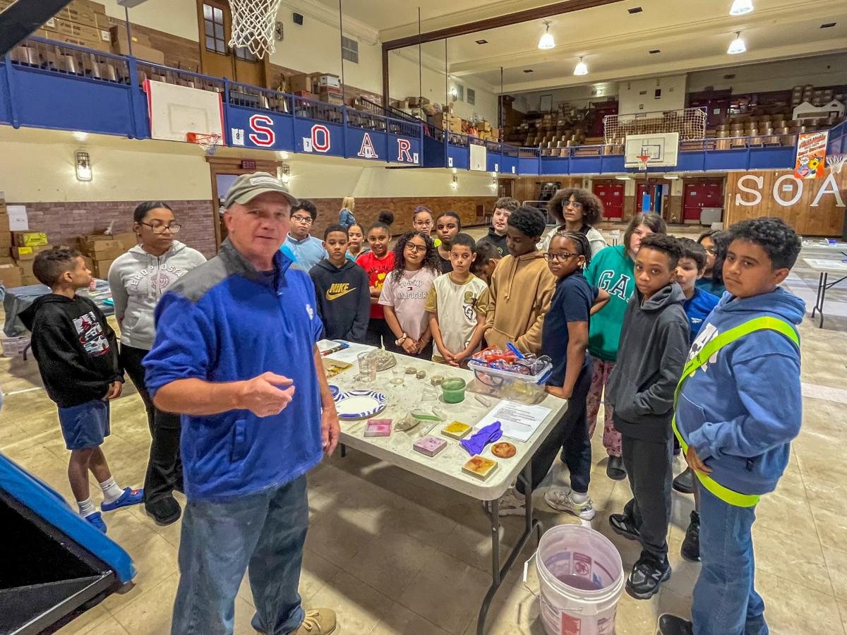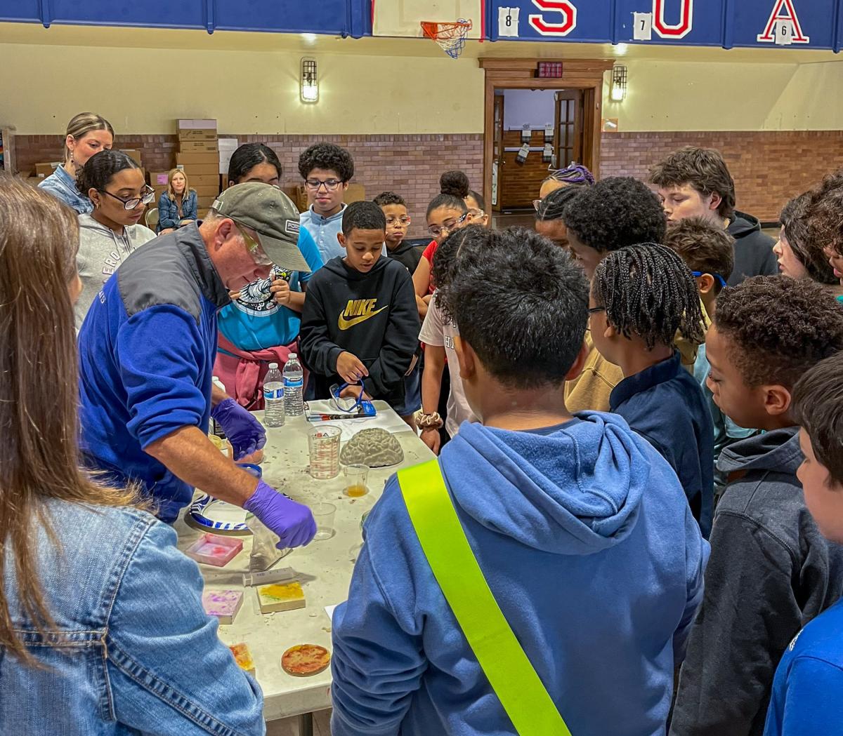 Franklin H. Reber, instructor of building construction technology at Penn College, demonstrates a concrete activity for fifth-graders at the Allentown School District’s Central Elementary STREAM Academy. He also enlightened the children on the many careers available in the concrete industry – including positions held by Penn College concrete science technology graduates.