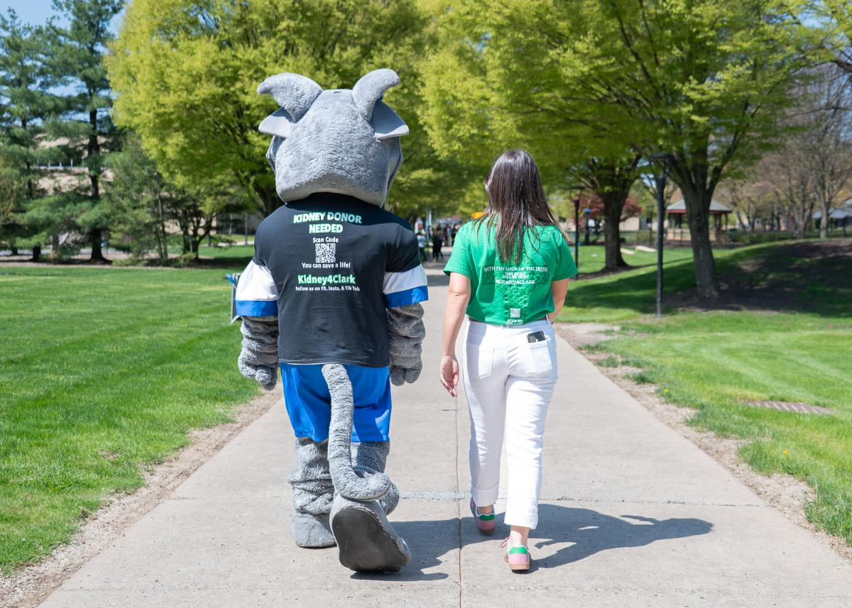 On the prowl for donors! Wildcat, escorted by Wellness Committee member Madison A. Hillson, sets off to promote "Kidney 4 Clark" and other "Donate Life" needs. Hillson is a people and culture specialist.