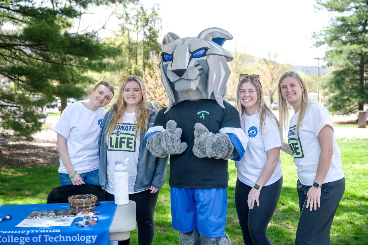 Pennsylvania College of Technology nursing students gather with members of the college’s Wellness Committee at a Donate Life event hosted at the college during National Donate Life Month as part of the students’ participation in the Gift of Life College Challenge. Students planned a series of events to educate the community about organ donation and to register new donors. From left: Wellness Committee members Megan F. Rogers and Carmen Terry; nursing students Caitlyn A. Kleinfelter, of Lebanon, Emily L. Ferguson, of Canton, and Marley L. Showers, of Selinsgrove; Heidi Weeder, of UPMC; the Penn College “Wildcat”; and Wellness Committee members Madison A. Hillson, Timothy M. Weigle and Tami J. Delinski.