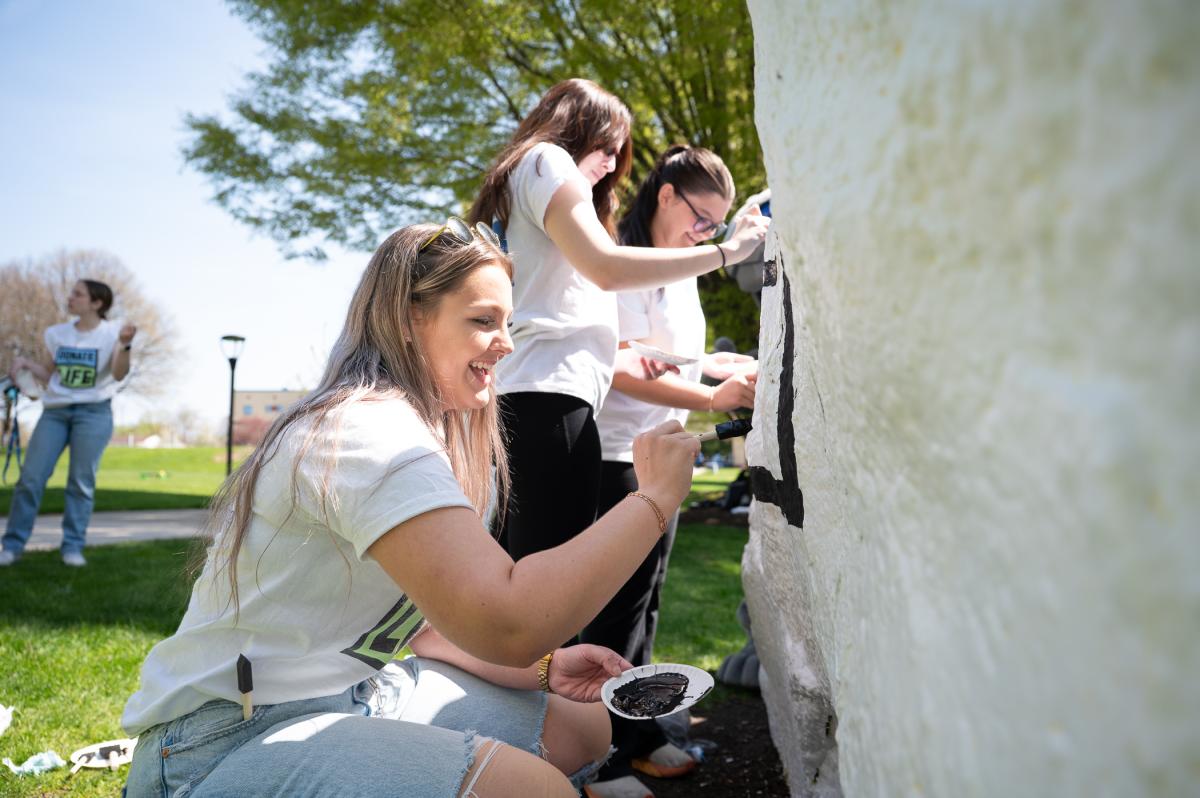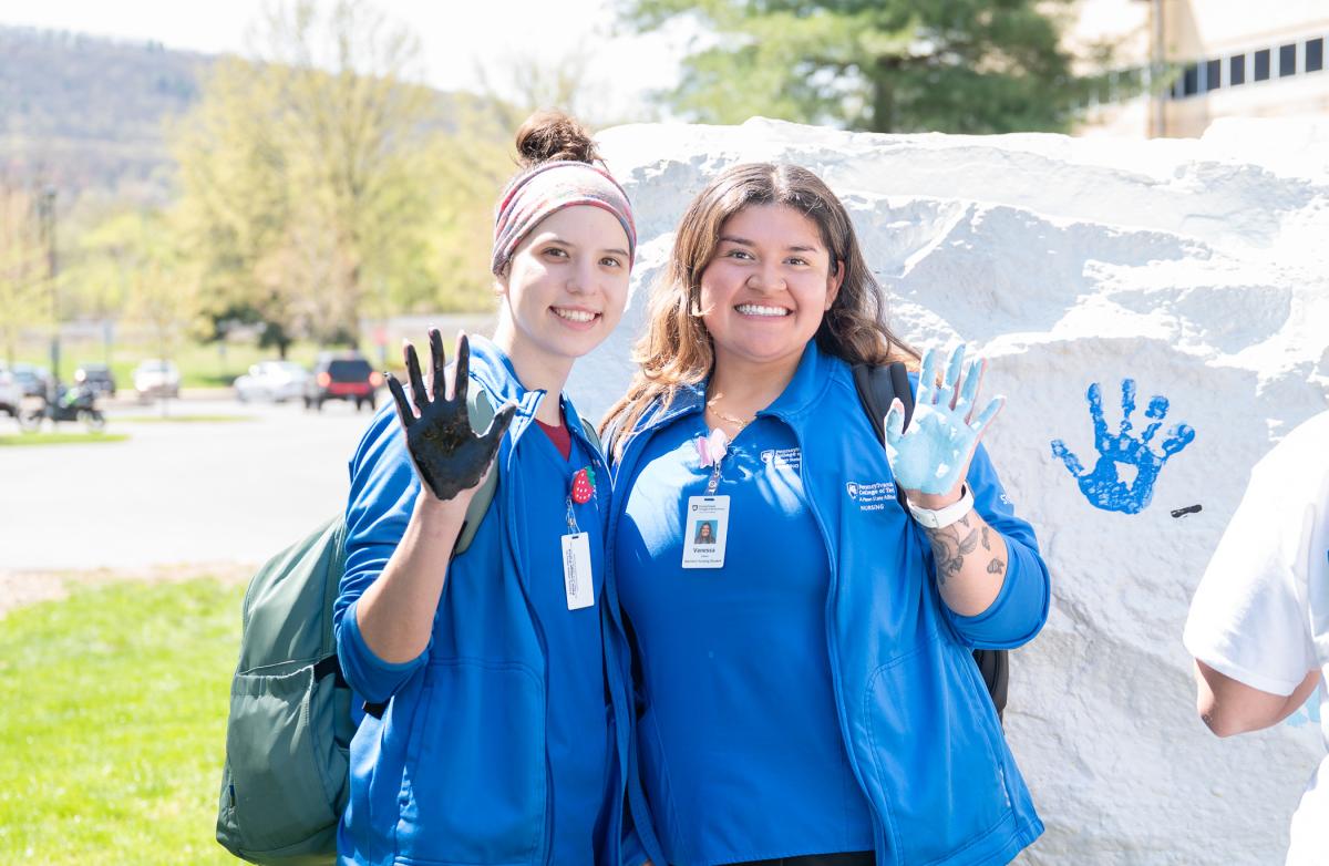 Hands-on helpers, indeed! Nursing students prepare to "make their mark" on the campus landmark.