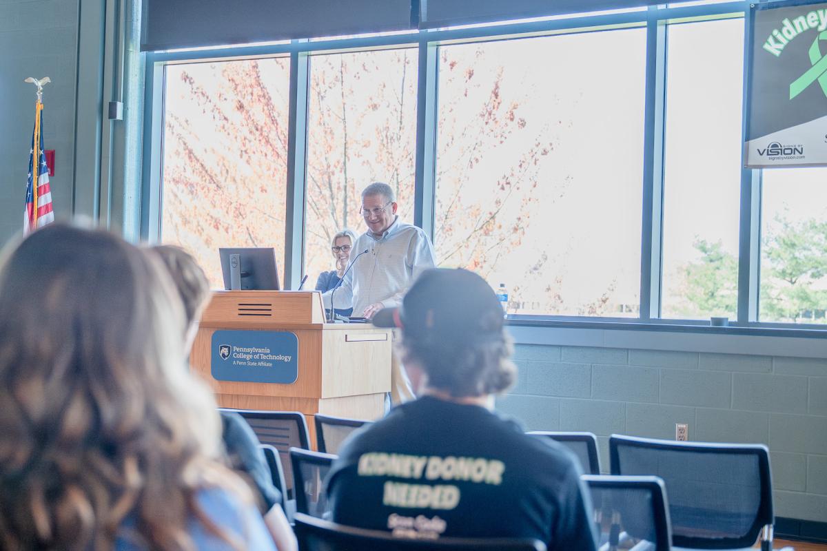 Among speakers at a "Donate Life" event, held in Penn's Inn, were Clark and Lia Pitura (behind podium), parents of a Penn College student. A New York City police detective, Clark was in need of a kidney transplant (and received one on June 10).