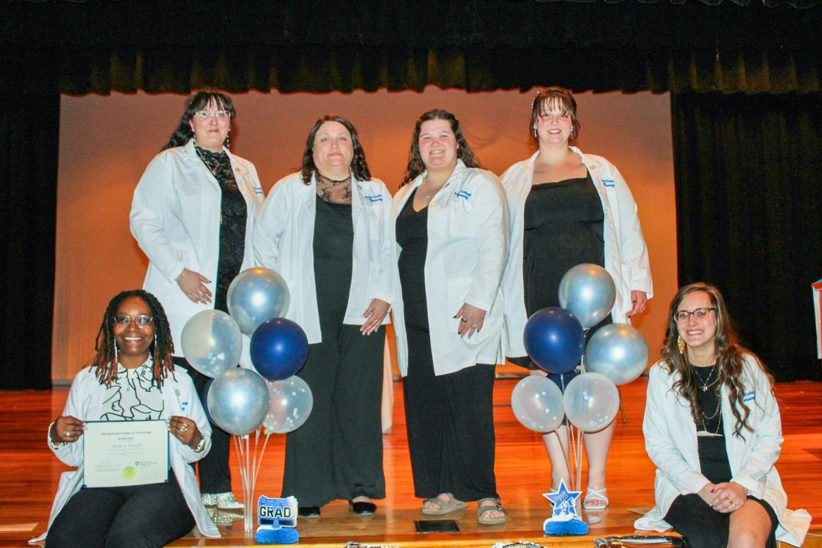 Graduates of the part-time practical nursing program gather at the Deane Center for the Performing Arts. From left: Stephanie Lundy, Gabriella Losinger, Rylee Kerstetter, Melissa Evans and Penelope Diehl.