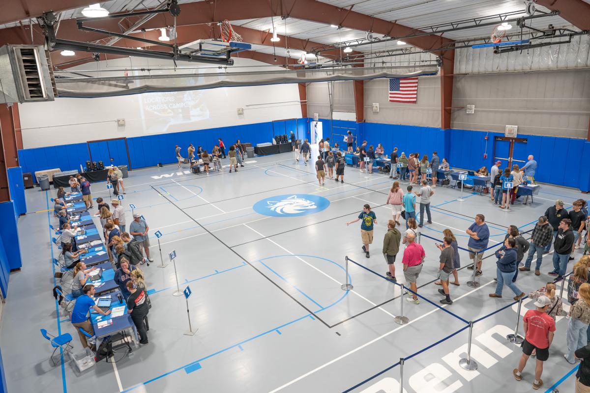 Employee and student volunteers answer visitor questions during check-in in the Field House.