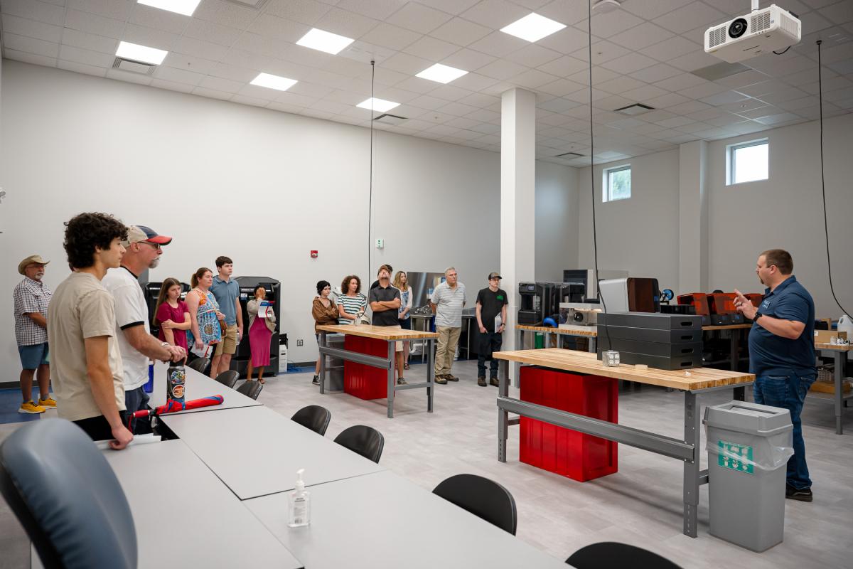 Guests file past one of many student-fabricated sculptures – a representation of the college’s athletics logo – to explore facilities in College Avenue Labs.