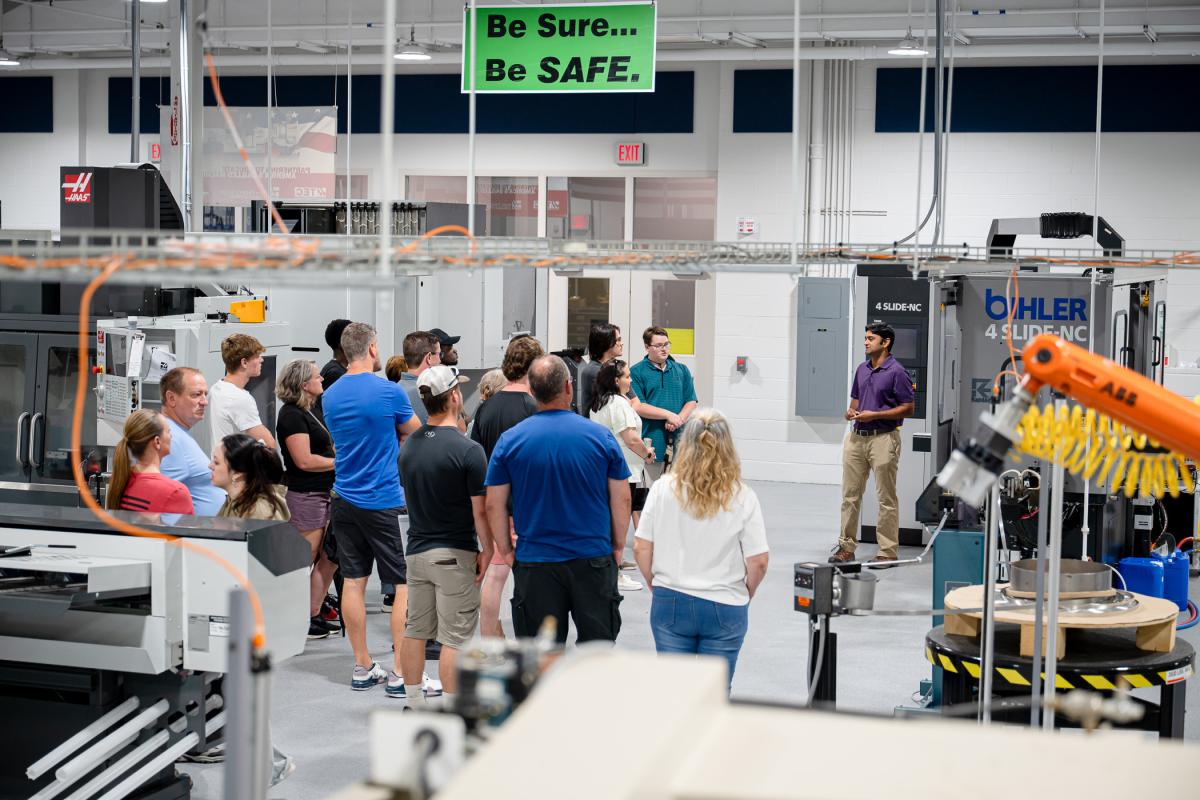 In the Gene Haas Center for Innovative Manufacturing, manufacturing engineering technology instructor Krishna C. Vistarakula talks with guests about the college’s automated manufacturing and machining majors.