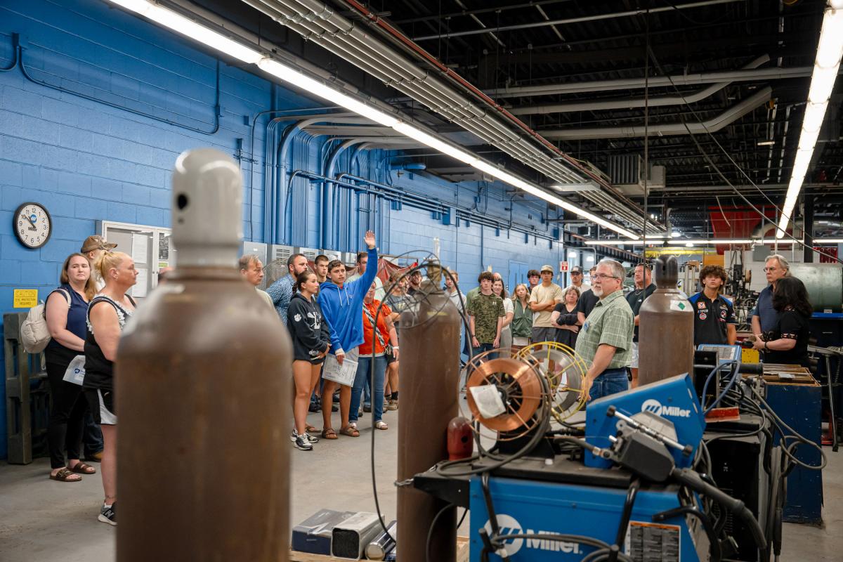 Michael R. Allen, instructor of welding, fields questions during a tour of the college’s 55,000-square-foot Lycoming Engines Metal Trades Center.