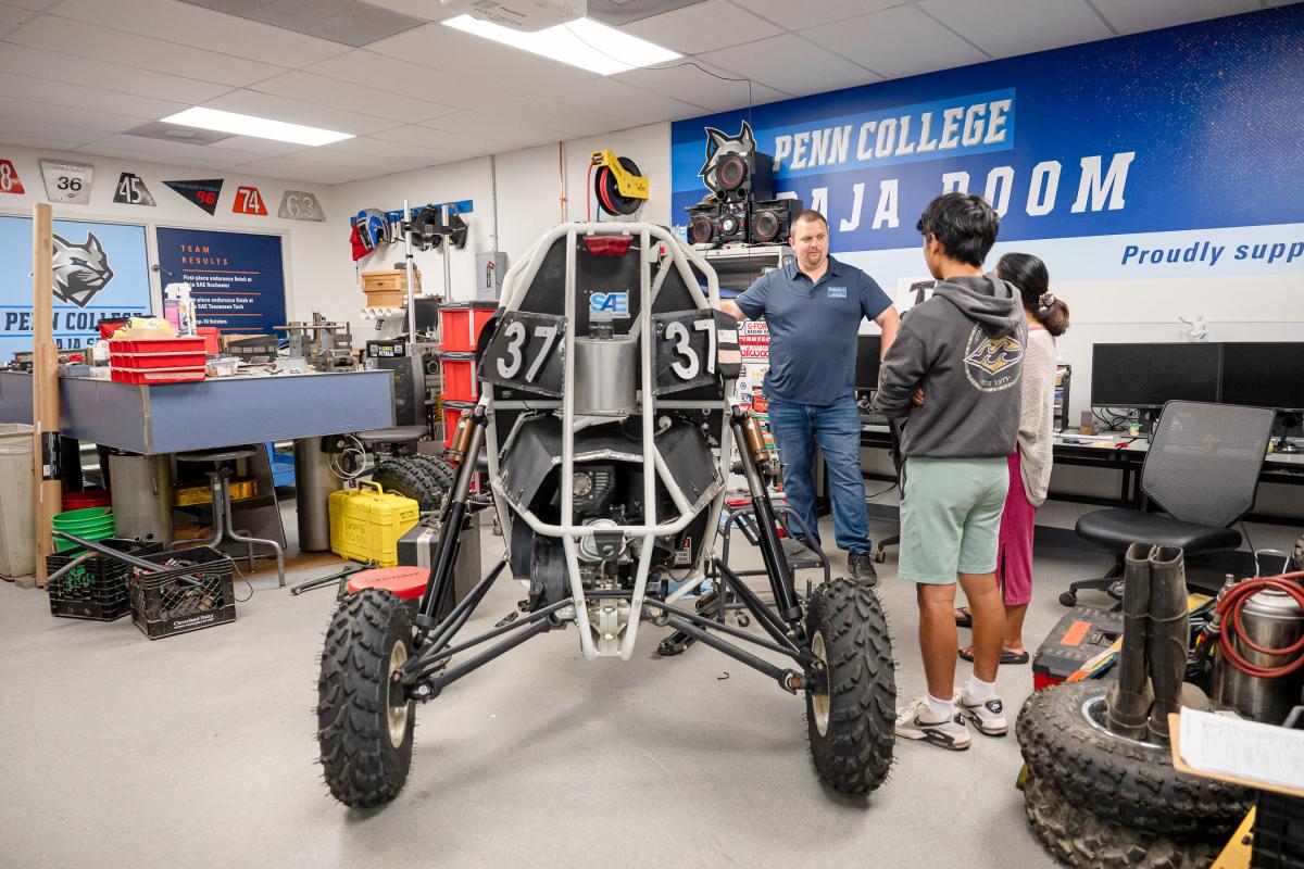 Alex E. Marconnet, instructor of engineering design, shows guests around the Penn College Baja Room, the headquarters for a successful student team that manufactures an off-road vehicle for intercollegiate competition.