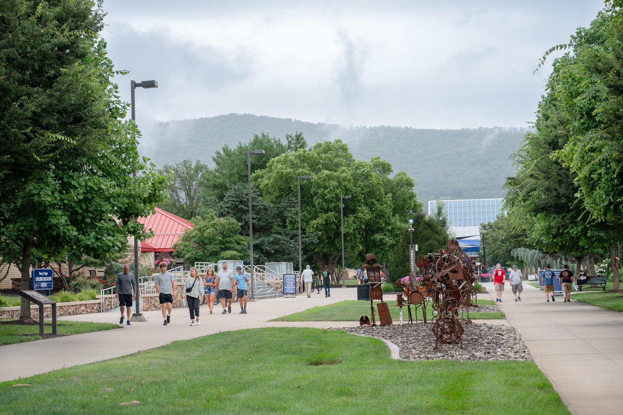 The campus mall, lined by plants and student-created sculptures, gives visitors a taste of the campus's beauty.