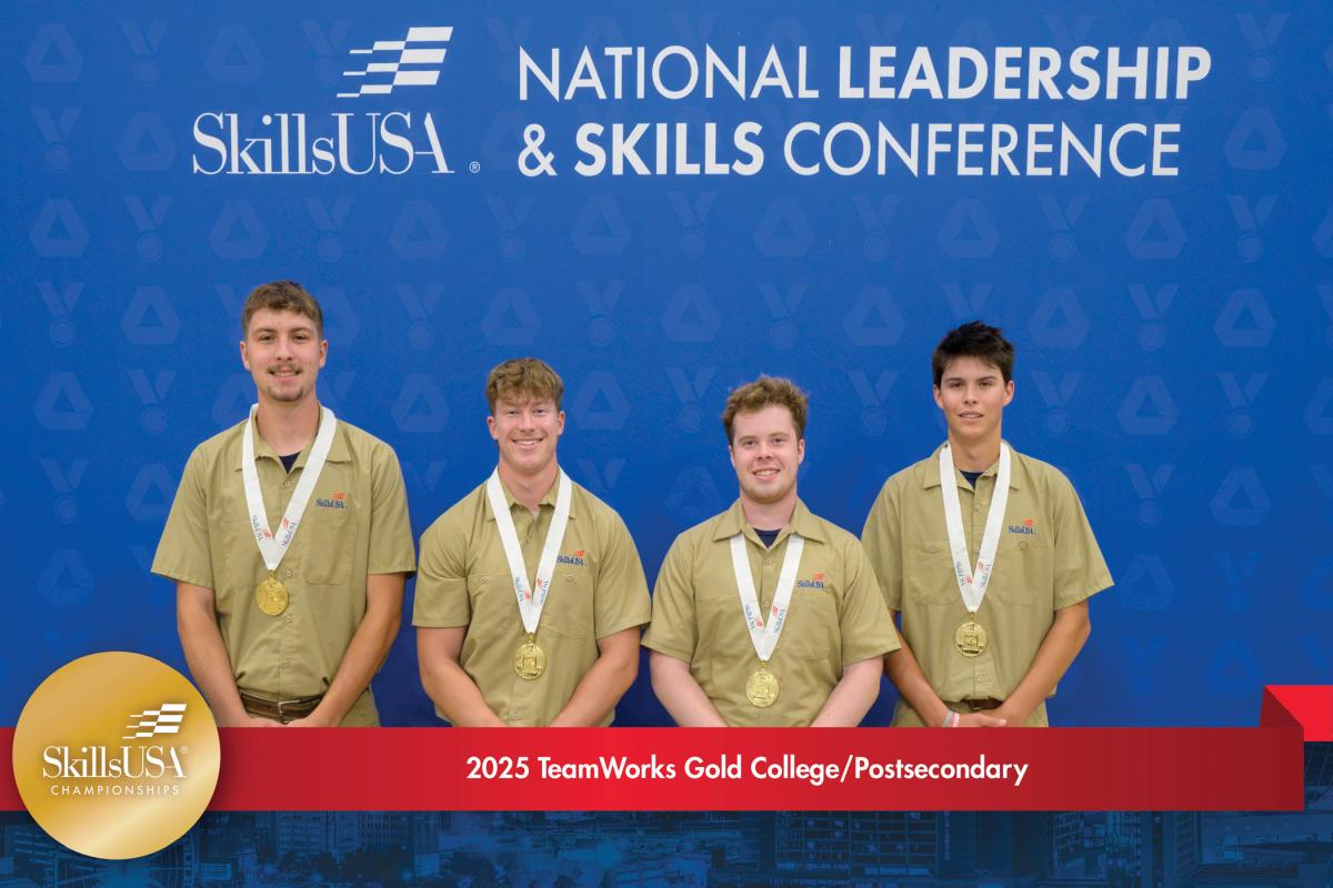 Pennsylvania College of Technology building construction technology students earned gold medals in the TeamWorks competition at the national SkillUSA Championships, held in Atlanta in June. From left: Sam J. Thornton, of Havertown; Kane S. Wright, of Williamsport; Owen W. Brackbill, of Doylestown; and Kole L. Fries, of Honesdale. (Photo Credit: SkillsUSA)