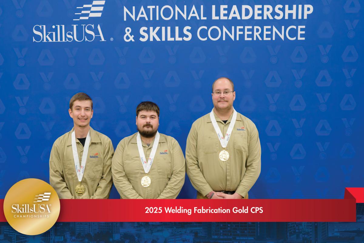 Pennsylvania College of Technology welding & fabrication engineering technology students (from left) Clayton J. Fegley, of McClure; Tyler C. Martin, of Selinsgrove; and Samuel R. Laudenslager, of Middleburg, earned gold in the welding fabrication competition at the national SkillsUSA Championships. (Photo Credit: SkillsUSA)