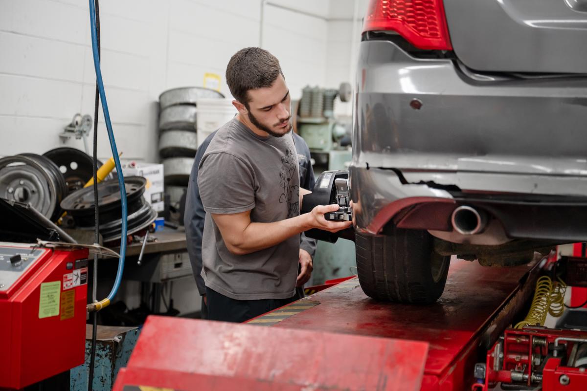 An Automotive Technology camper practices tire alignment.