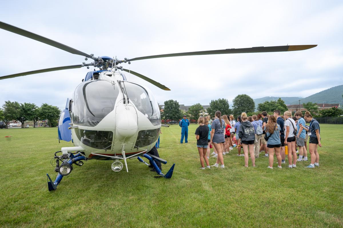 A Geisinger Life Flight helicopter and crew make their traditional landing on the Madigan Library lawn for Health Careers Camp, providing perspective on their lifesaving work.