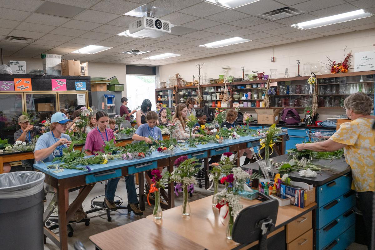 Design, Build & Grow Landscape & Horticulture camp participants design floral arrangements under the lead of Karen R. Ruhl (far right), part-time instructor of horticulture.