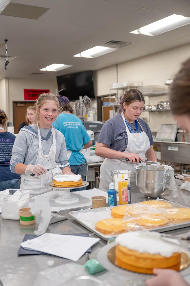 Campers spread frosting on one of several cakes they would make at Have Your Cake and Decorate It Too, where they learned introductory and advanced skills using buttercream, fondant and gum paste.