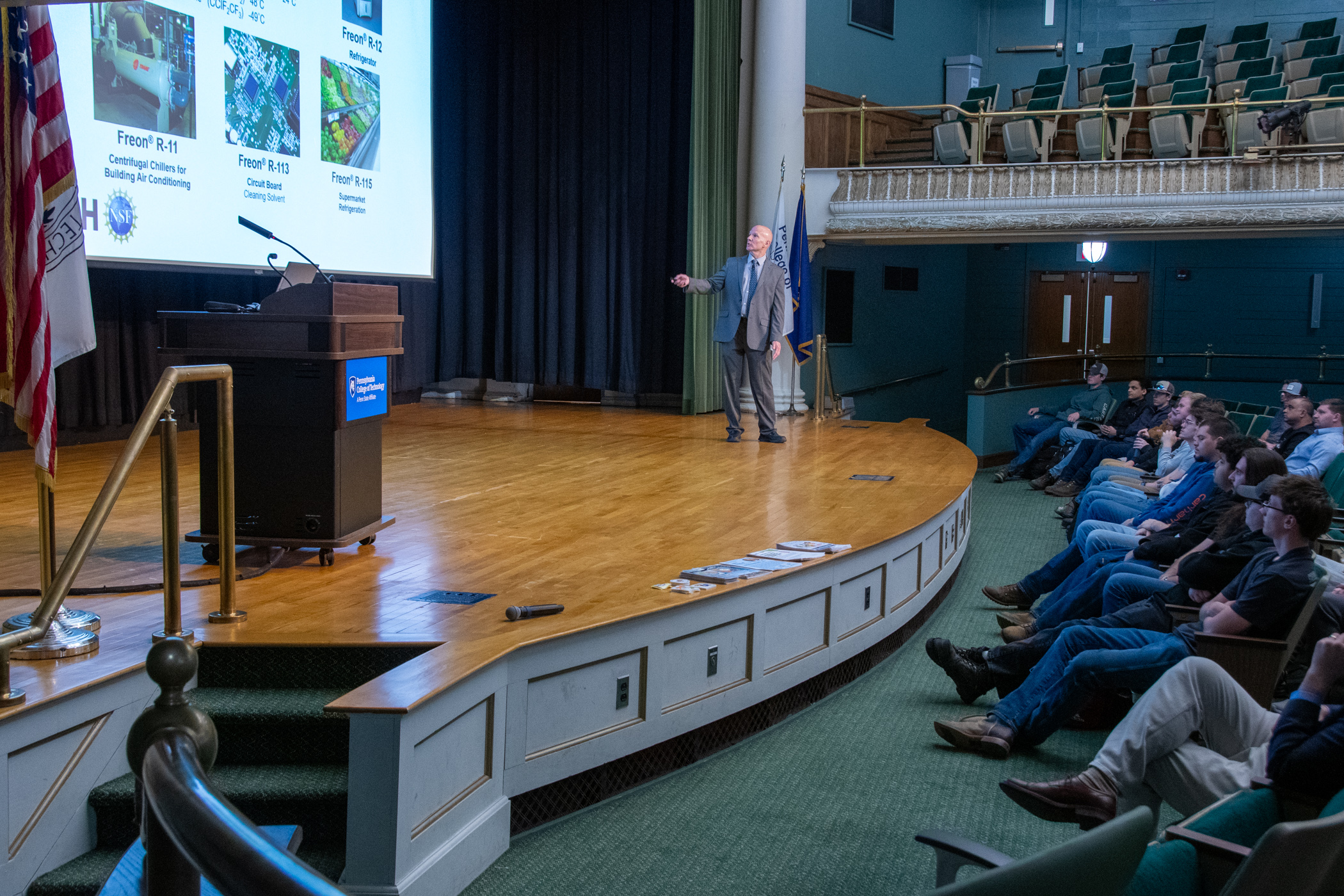 During his talk in the Klump Academic Center Auditorium, Shiflett explained that, as a result of leaks from current cooling systems, the hydrofluorocarbons commonly used as refrigerants cause about 8% of global greenhouse gas emissions. EARTH plans to facilitate repurposing and recycling 90% of refrigerants, create novel and environmentally safe refrigerants, and develop more energy-efficient HVAC-R systems with less than 1% refrigerant leakage (via sensors and self-healing additives).
