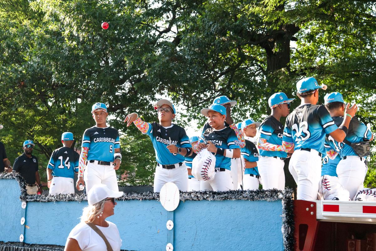 A player from the Caribbean team, which traveled from Aruba, throws a signed baseball into the crowd.