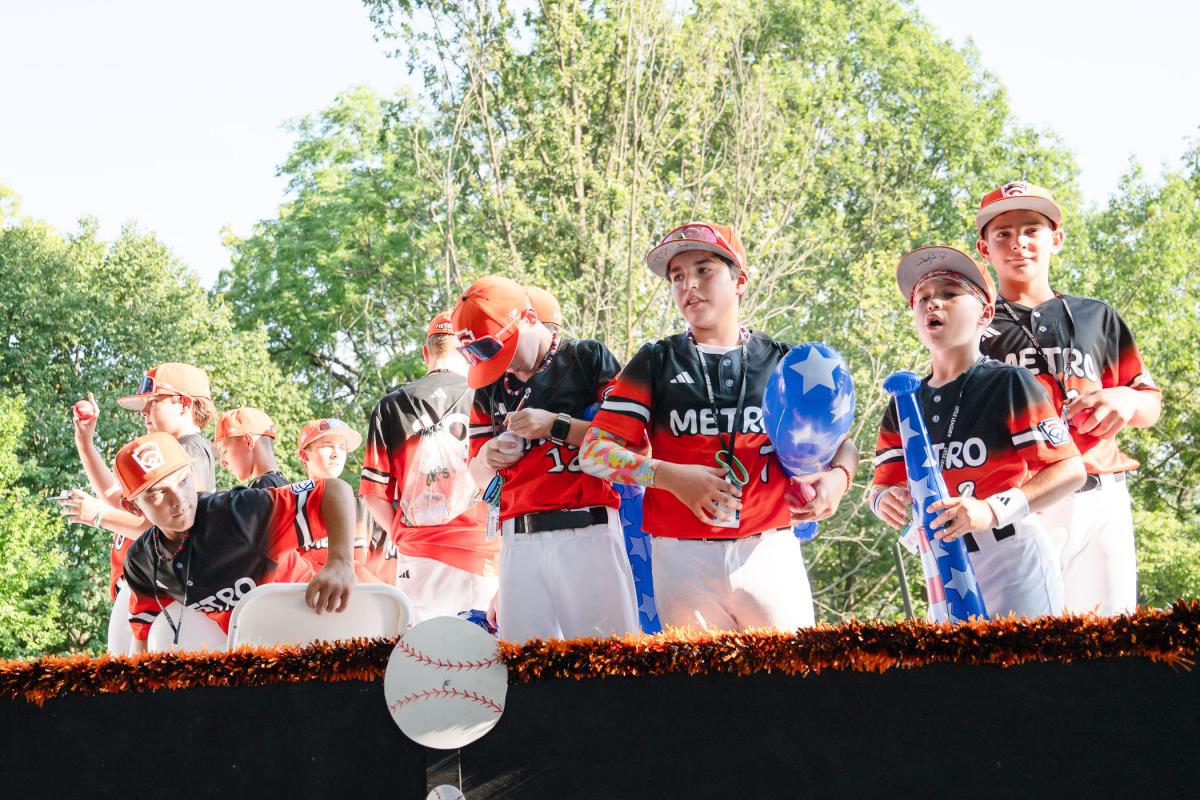 Fairfield, Conn., Little Leaguers sign balls tossed to them by the crowd. The team is representing the Metro Region.