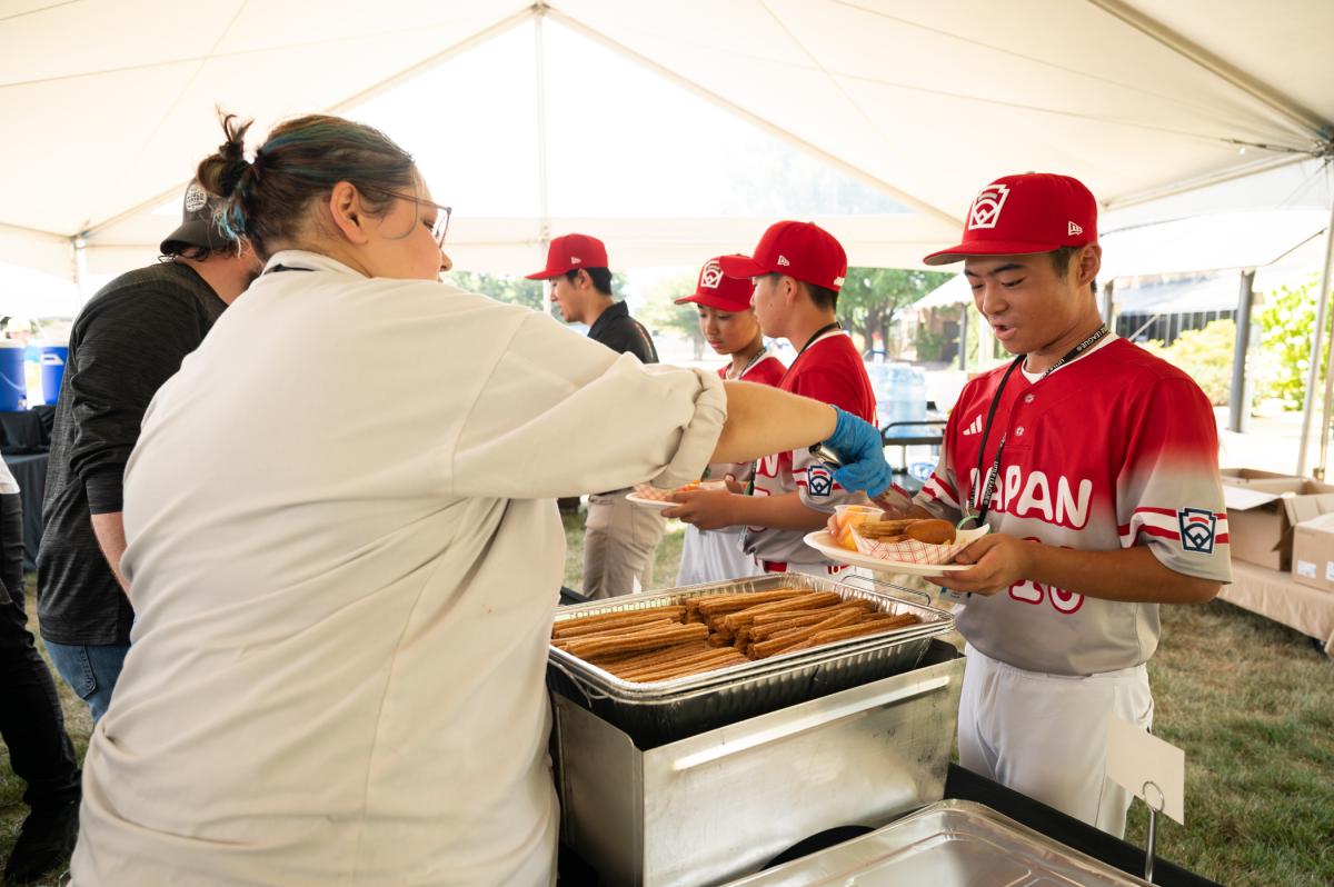 Ally A. Colon, a baking & pastry arts and applied management student from Philadelphia, serves a churro to a Japan team player.
