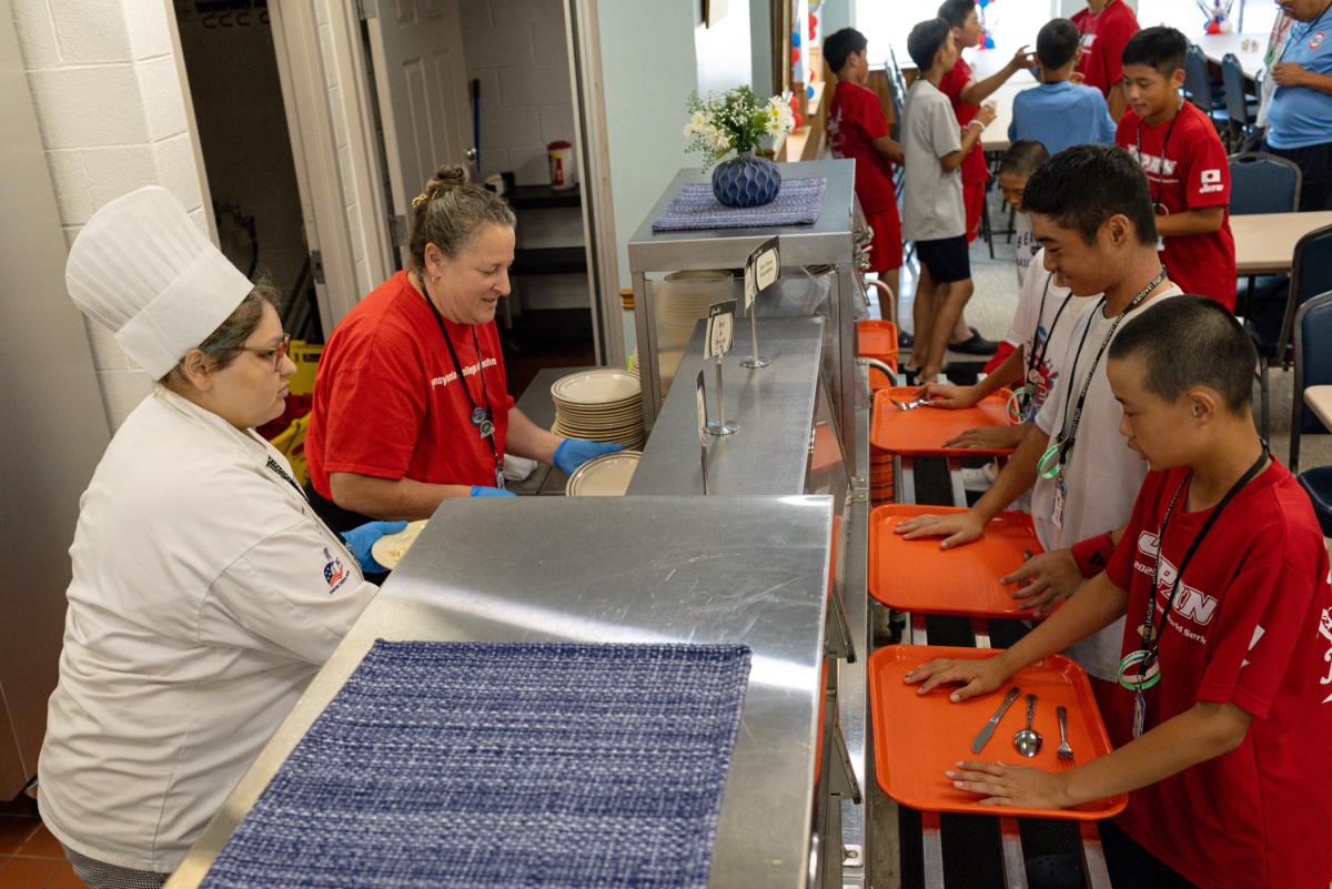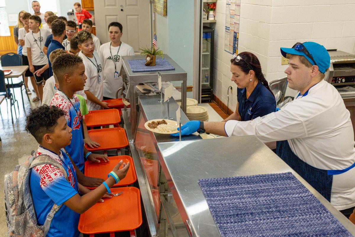 Le Jeune Chef Restaurant’s Andrea N. Breon, coordinator of restaurant operations/maitre d’hotel, and Patrick E. Hufnagle, pastry chef, serve teriyaki chicken to the players. (Photo courtesy of Little League Baseball and Softball)