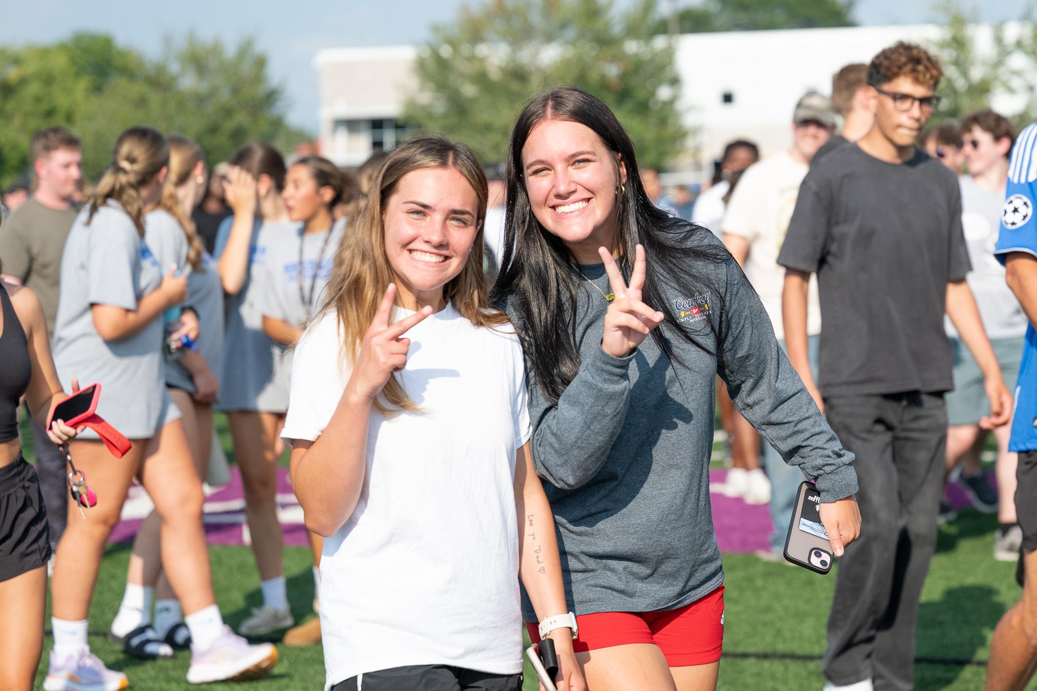 Two students share a laugh as they enjoy the activities during Friday night's Wildcat Welcome, including an inflatable bounce house and slide.
