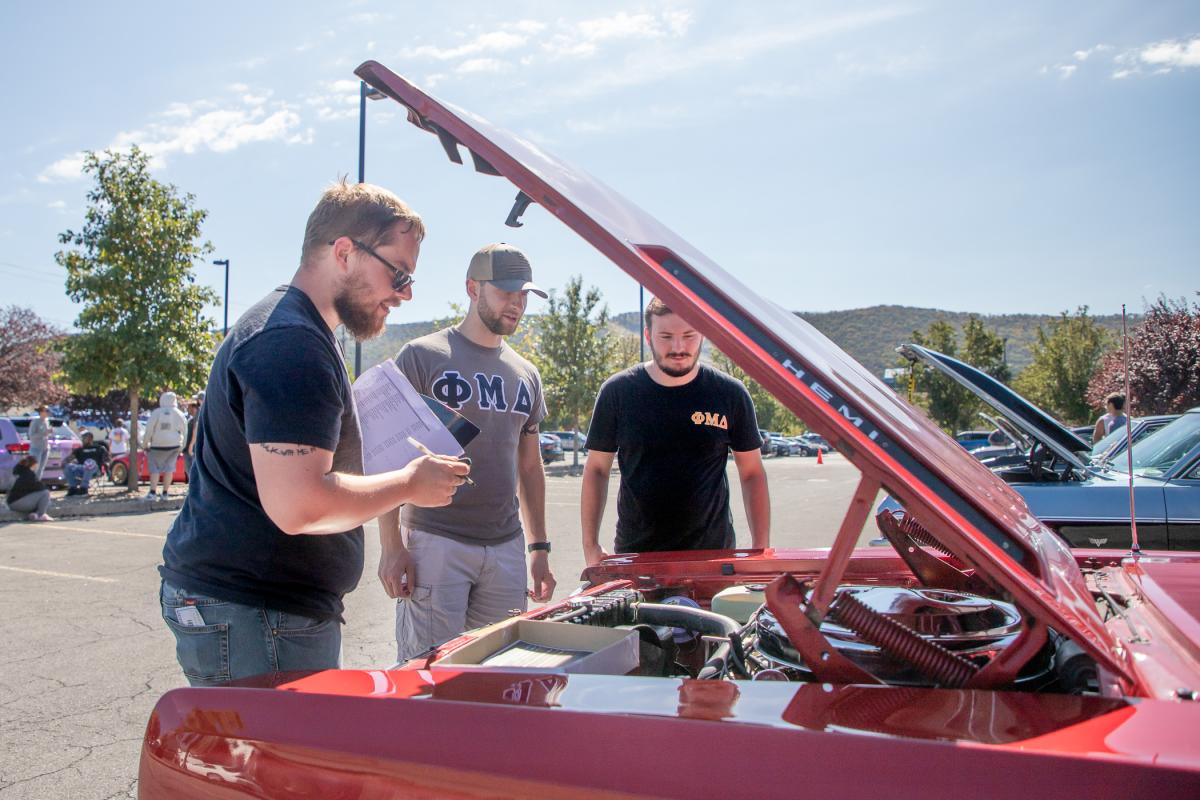 Phi Mu Delta brothers check out a classic car during the fraternity's car show, which drew 64 vehicles and raised money for the Central Pennsylvania Food Bank.