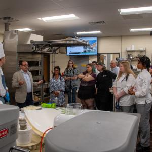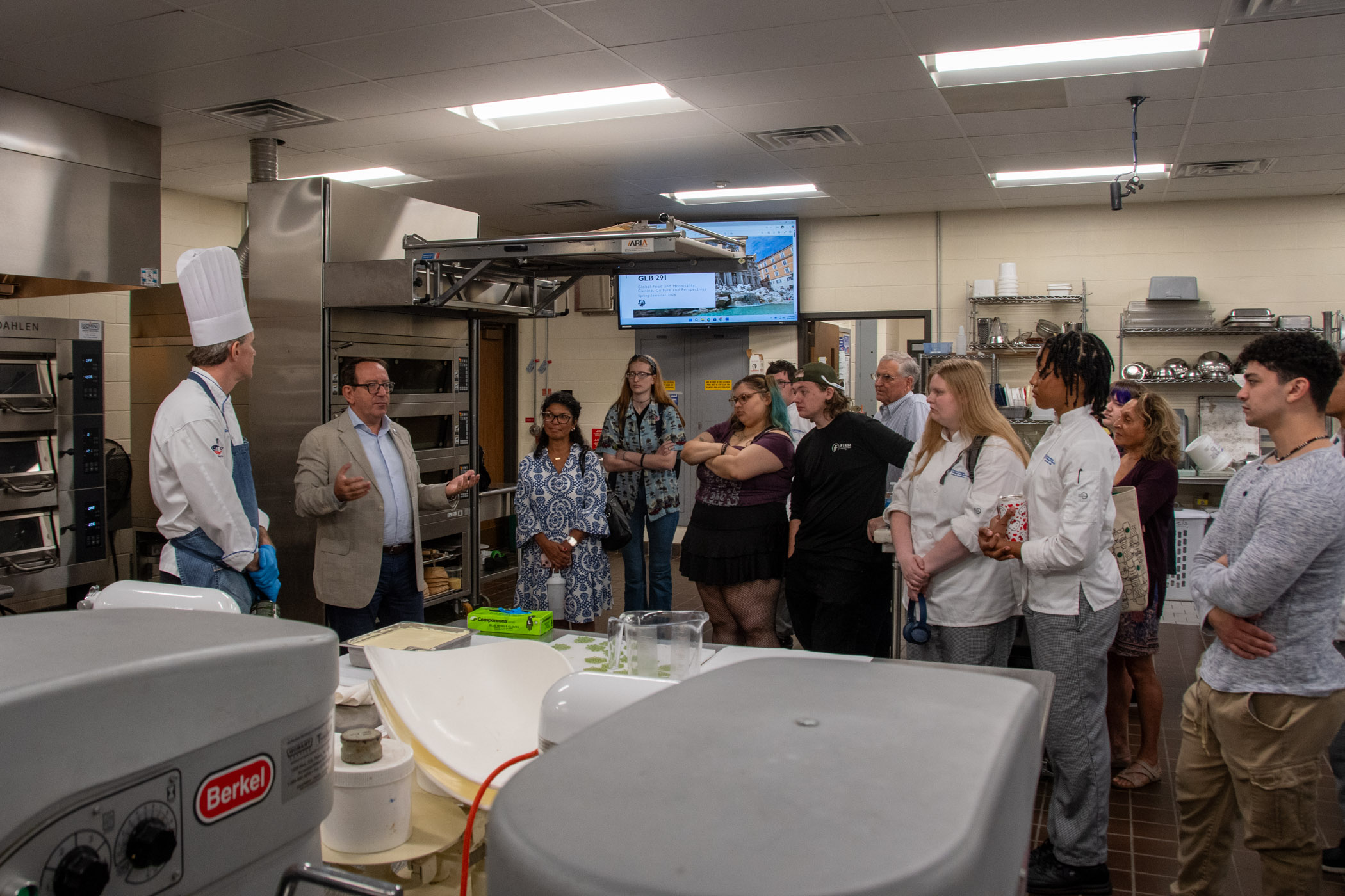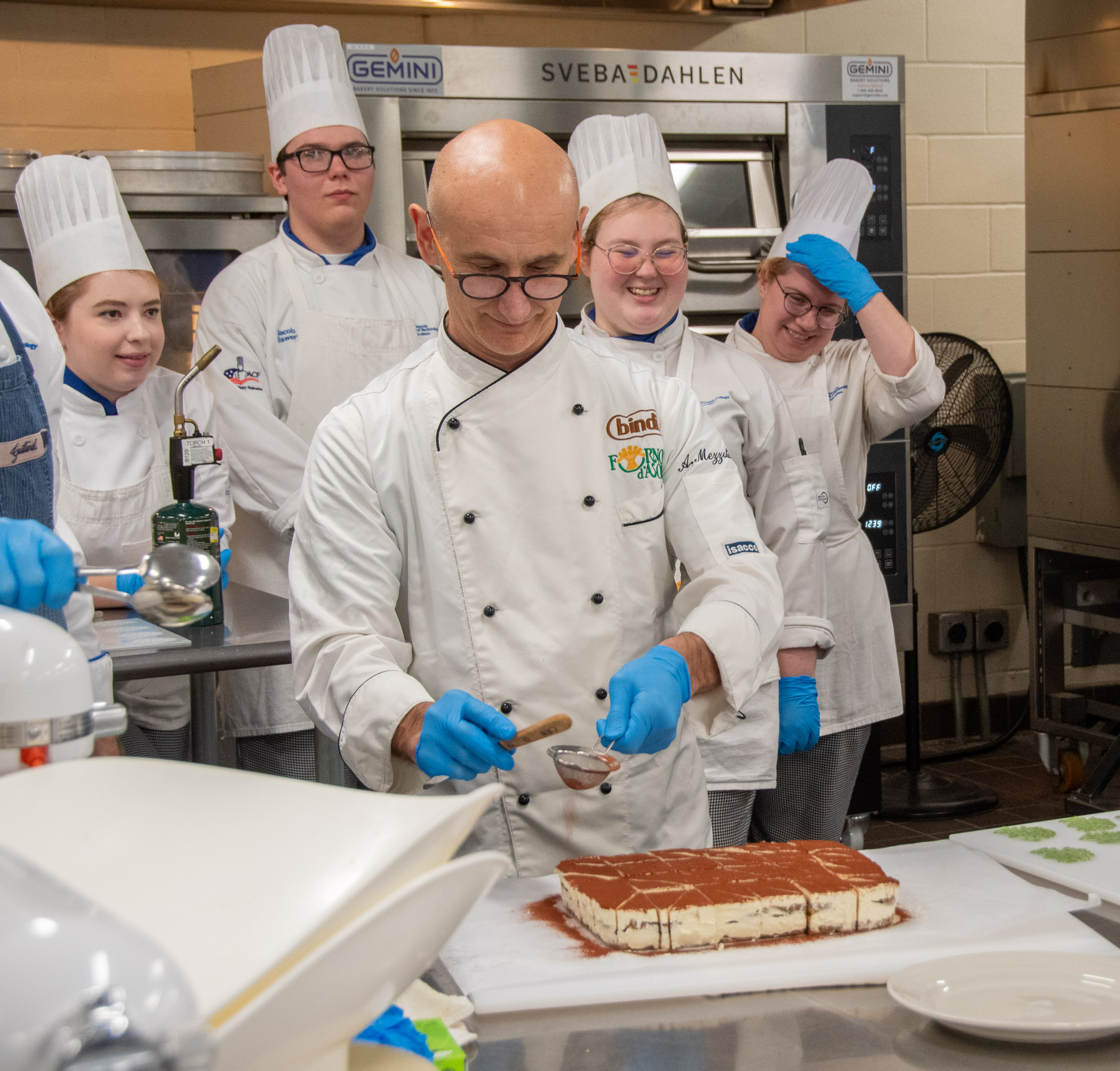 Chef Alberto Mezzoli, corporate chef for Bindi North America, spent time with students in the Customer Service & Retail Baking Operations class as they prepared an Italian-themed bread and pastry sale, then provided a demonstration for all those interested in the Global Food & Hospitality: Cuisine, Culture & Perspectives class.